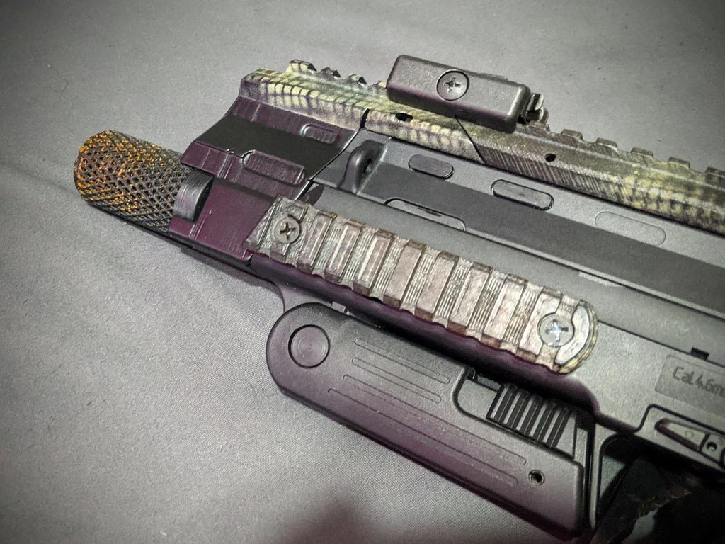 Muzzle brake cho H&K MP7 AEG (2019), tối ưu để dùng với ACETECH Lighter S tracer. Có kèm barrel adapter để gắn tracer và cover in kèm, hỗ trợ tăng không gian lắp pin và bộ riser/rail dễ in.
