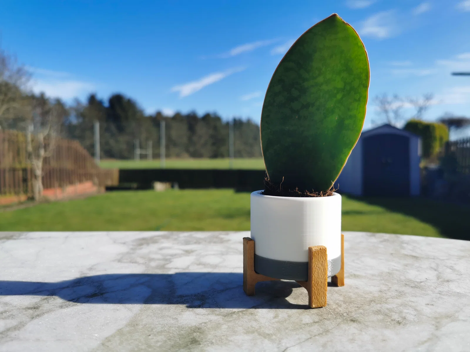 Chậu nhỏ ⌀6cm phong cách mid century cho cây Whale Fin succulent, có sẵn lỗ thoát nước và đĩa rời hứng nước. Gợi ý in: slice đúng hướng, 3+ perimeters để chống thấm và có thể dùng Fuzzy skin.