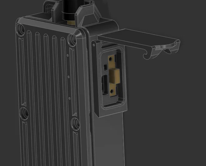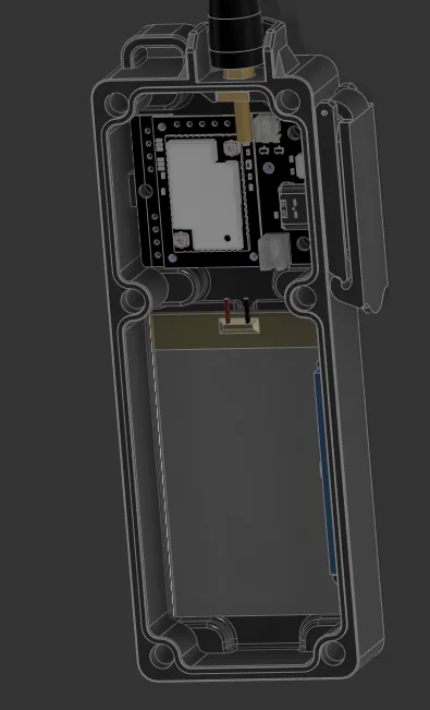 Có nhiều case Meshtastic ngon ngoài kia, nhưng mình muốn một cái vừa waterproof, form-factor mỏng (slim), dạng modular, và có thể tháo ra lắp lại. Cổng USB-C và công tắc nguồn của radio có thể thao tác qua nắp hông. Mình cũng thêm ren ở mặt sau để gắn phụ kiện như belt loop hoặc móc MOLLE.