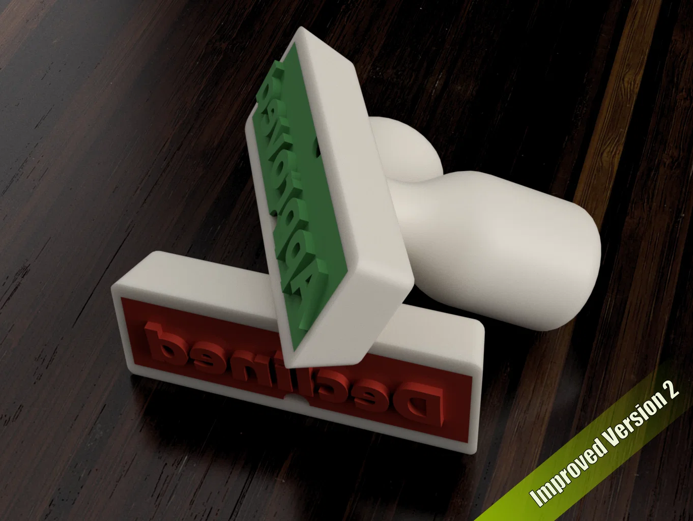 Mẫu con dấu (Stamp) in 3D có thể in không cần support (cần bridging). Khuyến nghị dùng TPU 95A cho phần đế. Kèm file Fusion360 để chỉnh chữ và chỉnh dung sai “surface offset”, cùng bản Stamp_V2 cải tiến độ bền và tiện dụng.