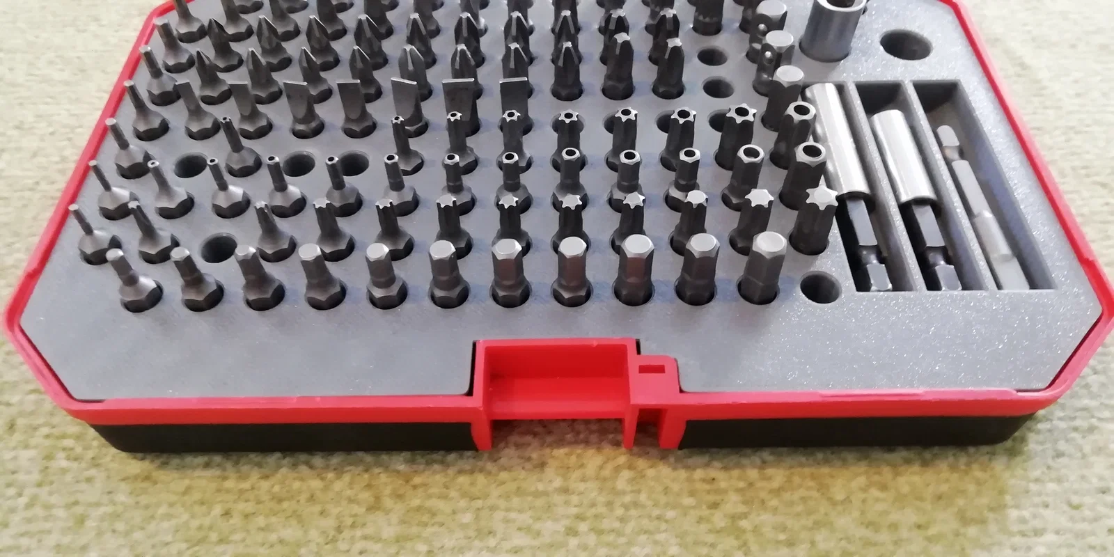 Bản standalone với dung lượng chứa bits còn nhiều hơn. Mình biết là đa số mọi người sẽ không có nhu cầu dùng bản insert này nếu không có sẵn bộ dụng cụ ‘Kraft Werkzeuge’ như trong hình. Nên mình chỉnh lại model thành bản standalone. Phiên bản này có 131 khe cho hex bits.