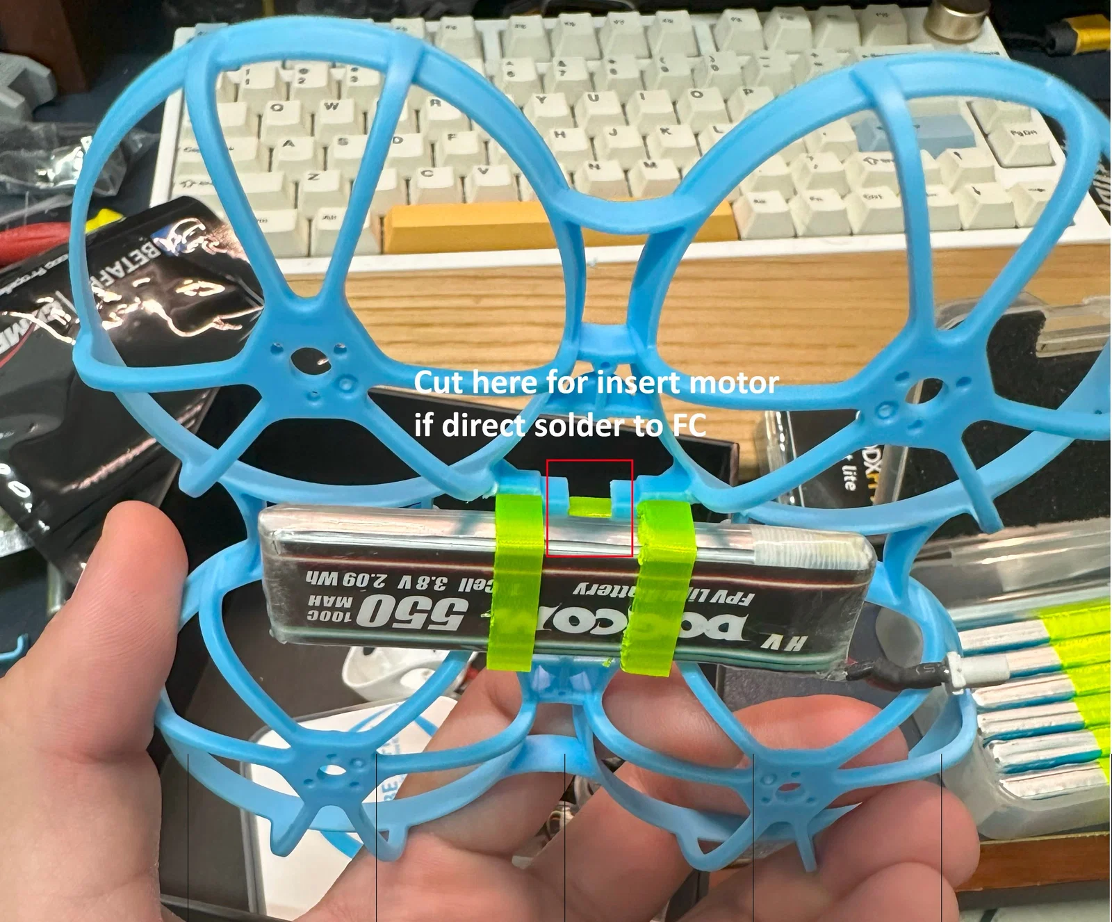 Bạn có thể cắt 2 thanh (bar) như hình để luồn/đi dây motor, trong trường hợp bạn hàn motor trực tiếp vào FC và muốn thay frame mới.