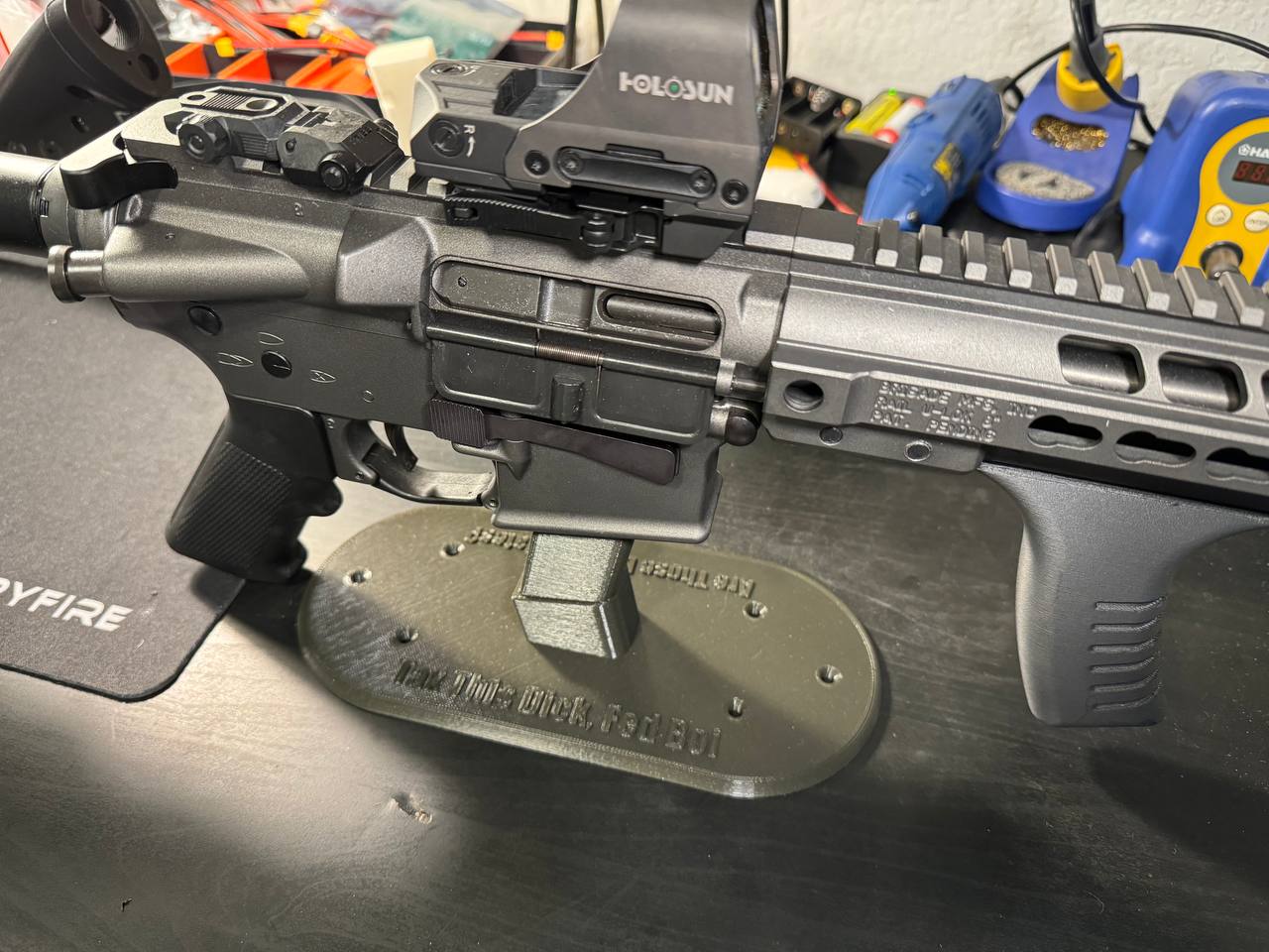Mình tạo mẫu này vì chán cảnh cứ phải đặt khẩu súng (airsoft) nằm trên bàn để vệ sinh hay độ chế. Cái stand này lấy cảm hứng từ vài mẫu Glock handgun stand mình từng thử, nhưng tụi đó bị mất cân bằng nên không đỡ nổi mấy khẩu (airsoft) của mình to và nặng hơn.