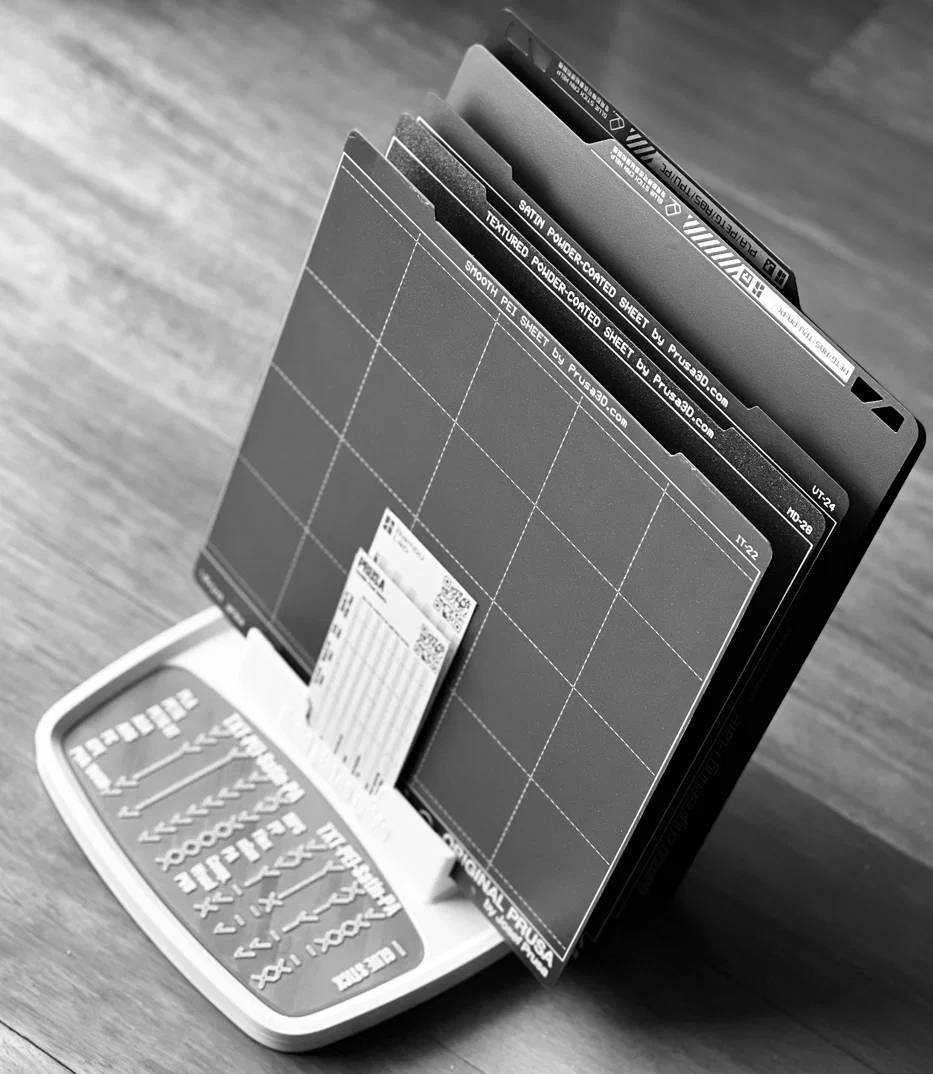 Giá đỡ build plate đa năng thuộc dự án Leaf, chứa tối đa 6 tấm plate từ nhiều hãng (Bambu Lab, Prusa…). Khuyến nghị in PETG/PLA cho phần chính, kèm chi tiết TPU/FLEX để giảm rung và đỡ êm cho steel sheet.