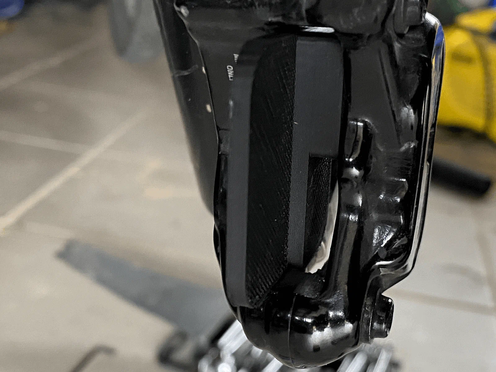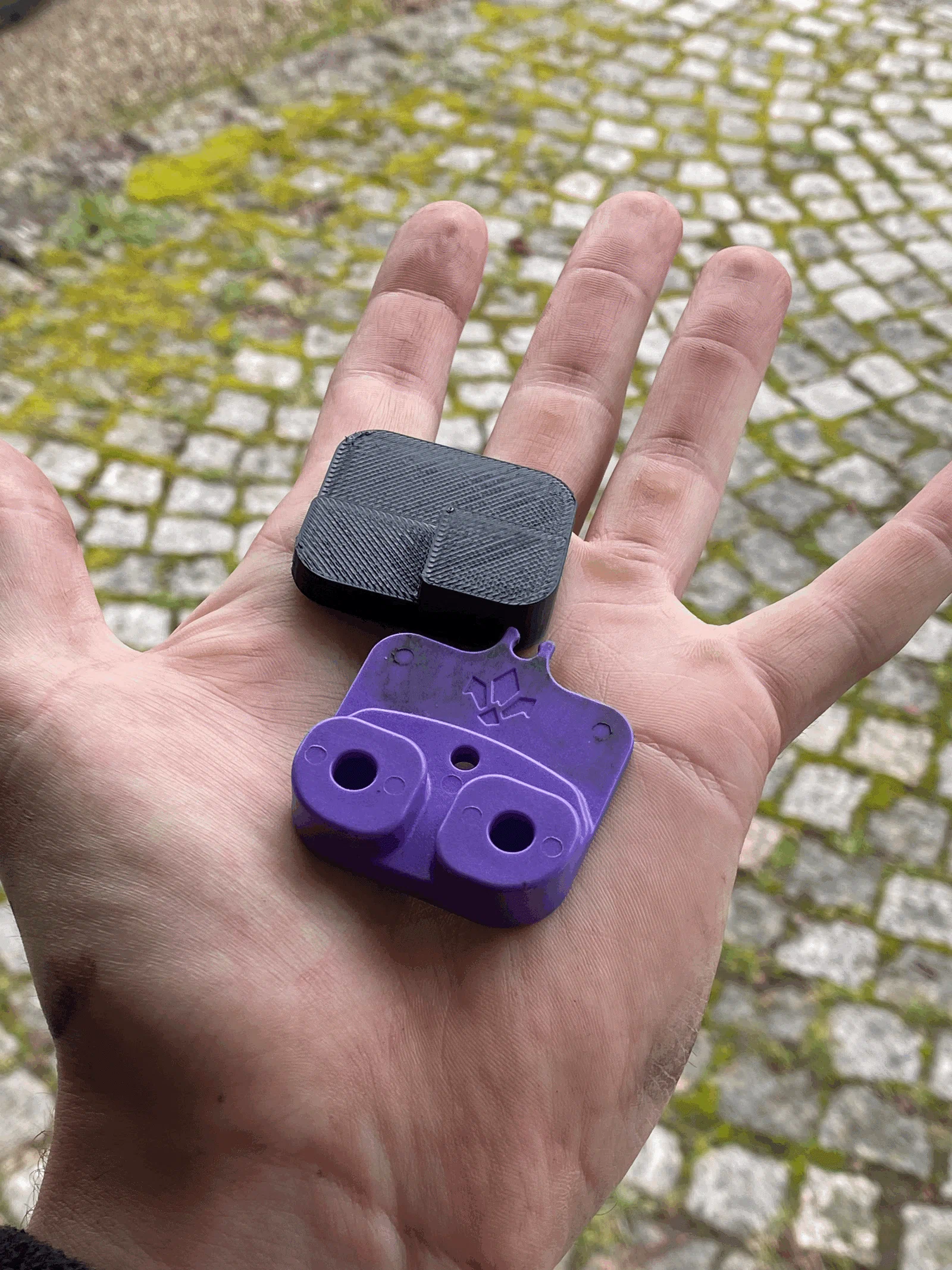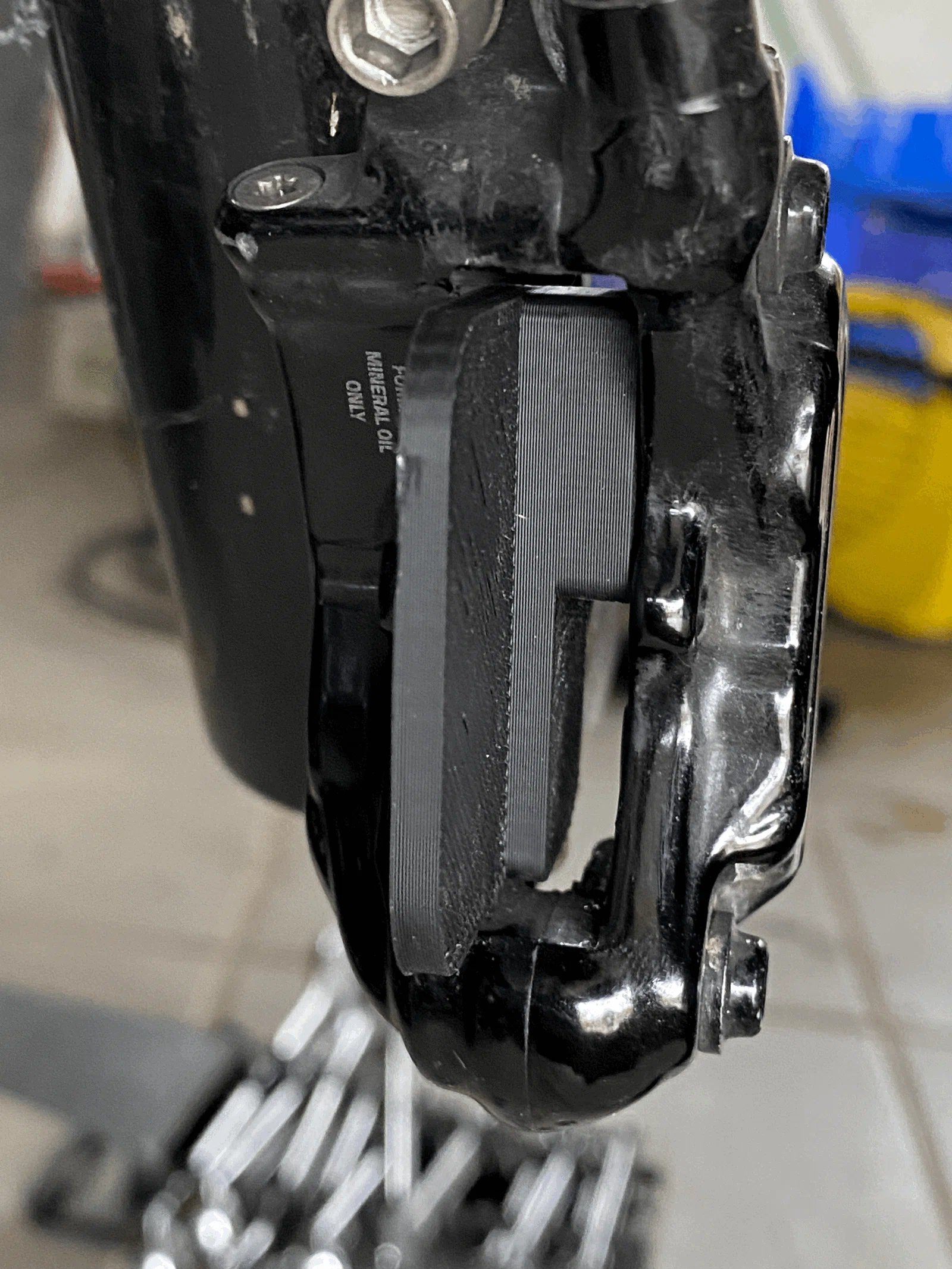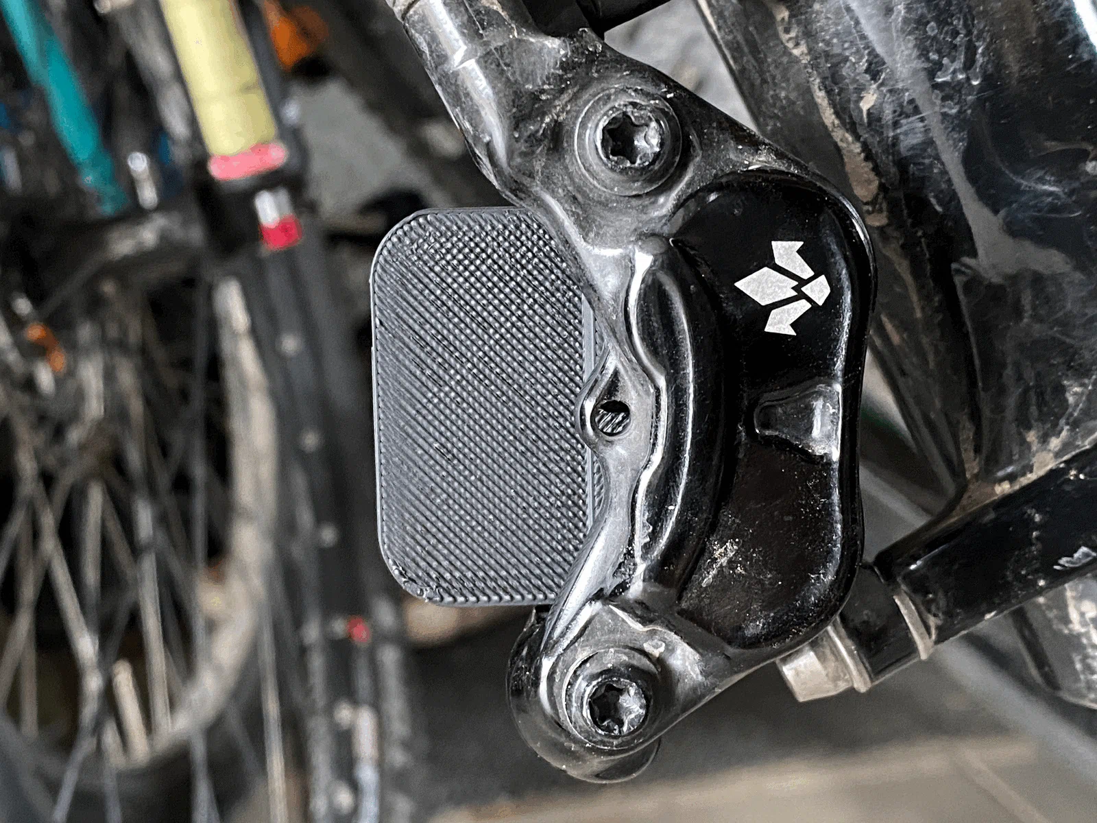 Bleeding/service block cho thắng đĩa Formula Cura 4. Dùng khi 1 piston bị kẹt: tháo bố thắng, đẩy piston vào heo, đặt phần khoét về phía piston kẹt rồi bóp tay thắng để piston đó chạy ra.