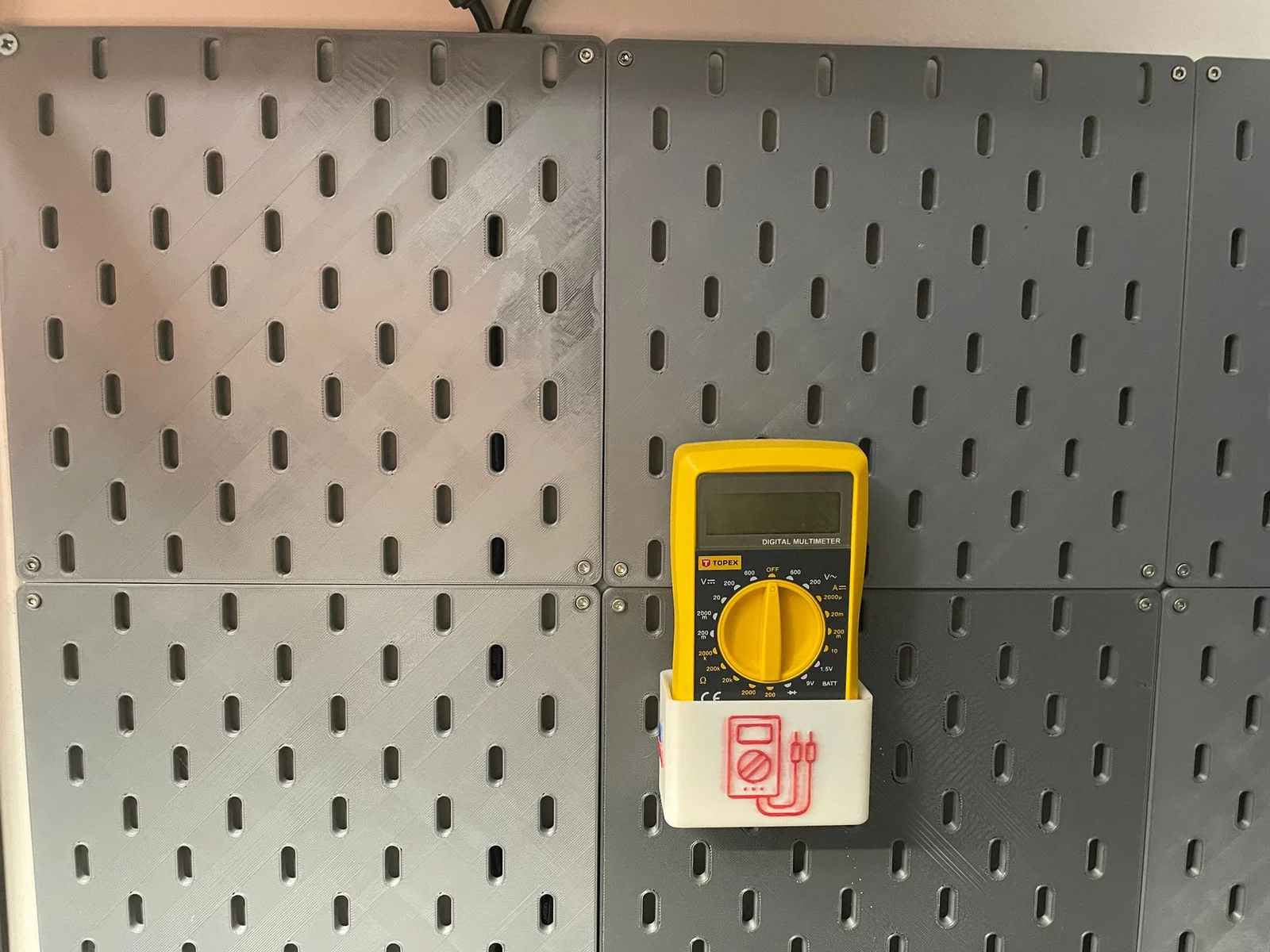Pegboard tùy biến vừa khay in Prusa MK3S (220×202×5 mm), tương thích organizer Ikea Skadis. Có connector nối 2/4 tấm và spacer gắn tường. Cần M3x8 + đai ốc M3 để ghép, và M6x30 + vít M4x40 để bắt tường.