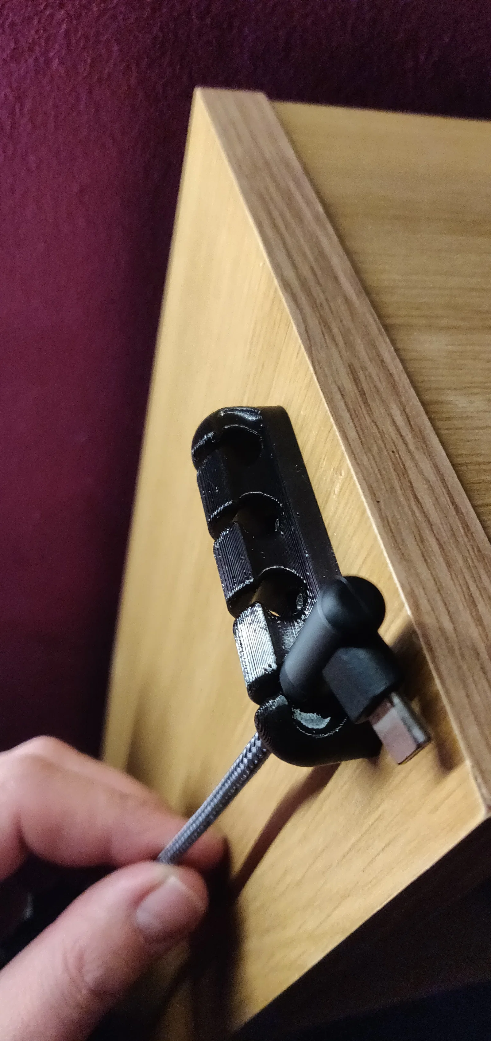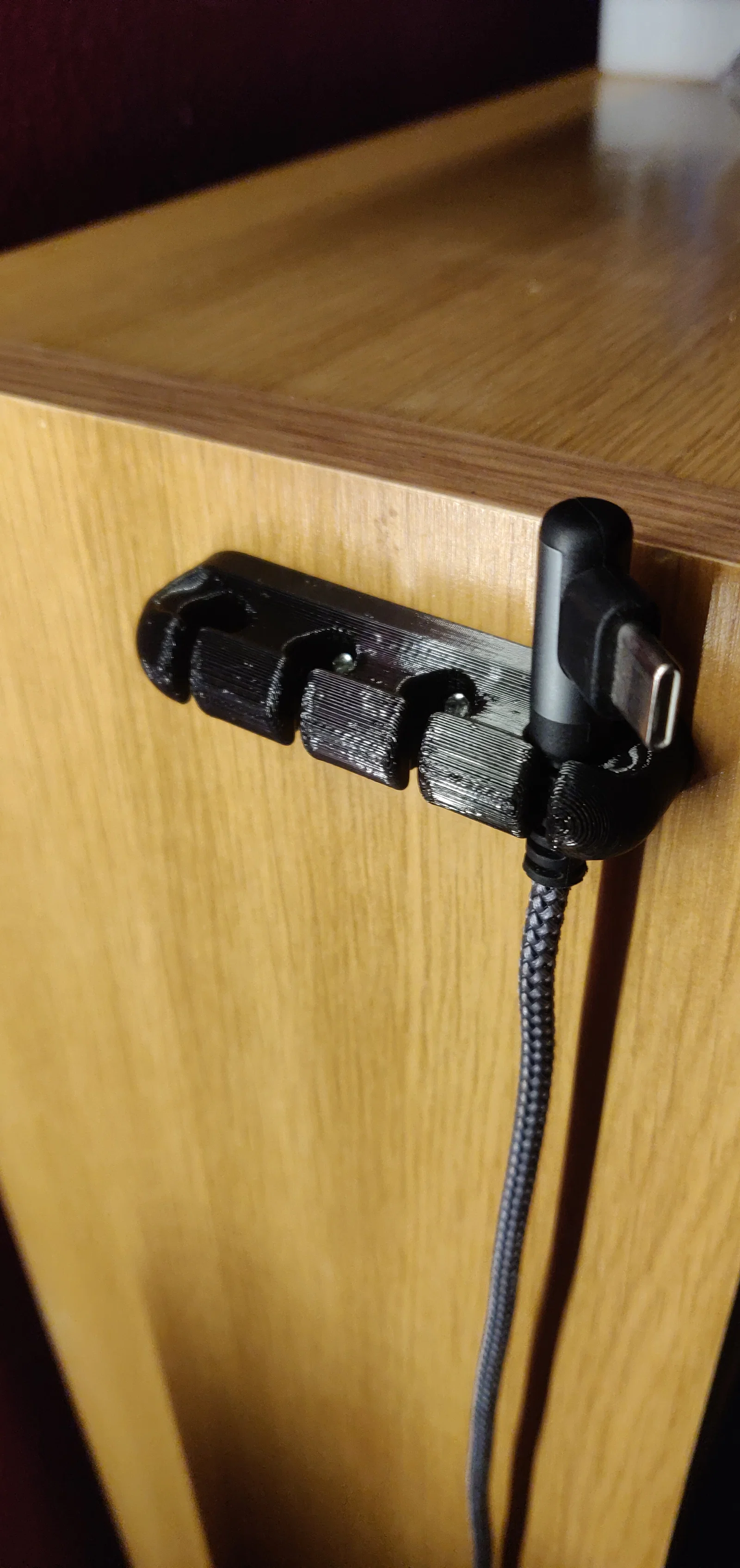 Cable Holder giúp giữ gọn tối đa 4 sợi cáp (USB hoặc cáp nhỏ), tránh rơi xuống sàn. Thiết kế có 2 lỗ 3.2mm với countersink 5.2mm để bắt vít gỗ lên tường/tủ; có thêm bản dùng command strips cắt 10×46mm.
