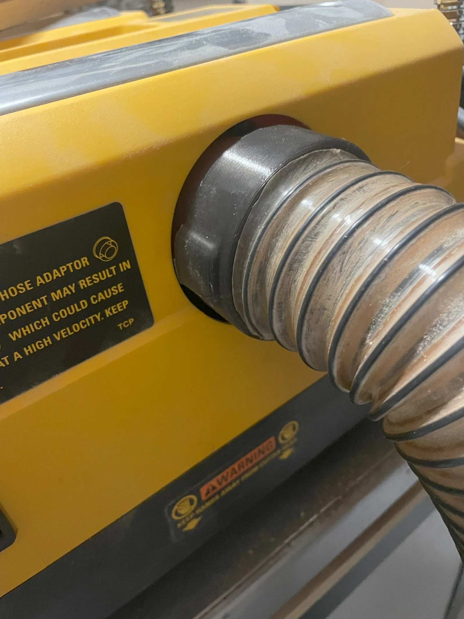 Adapter cổng hút bụi thay thế cho máy bào độ dày Dewalt DW735, nhận ống 2.5". Thiết kế gia cố phần chốt cố định, có ren hỗ trợ lắp ống chặt; khuyên dùng thêm hose clamp. In PETG, đề xuất 100% infill.