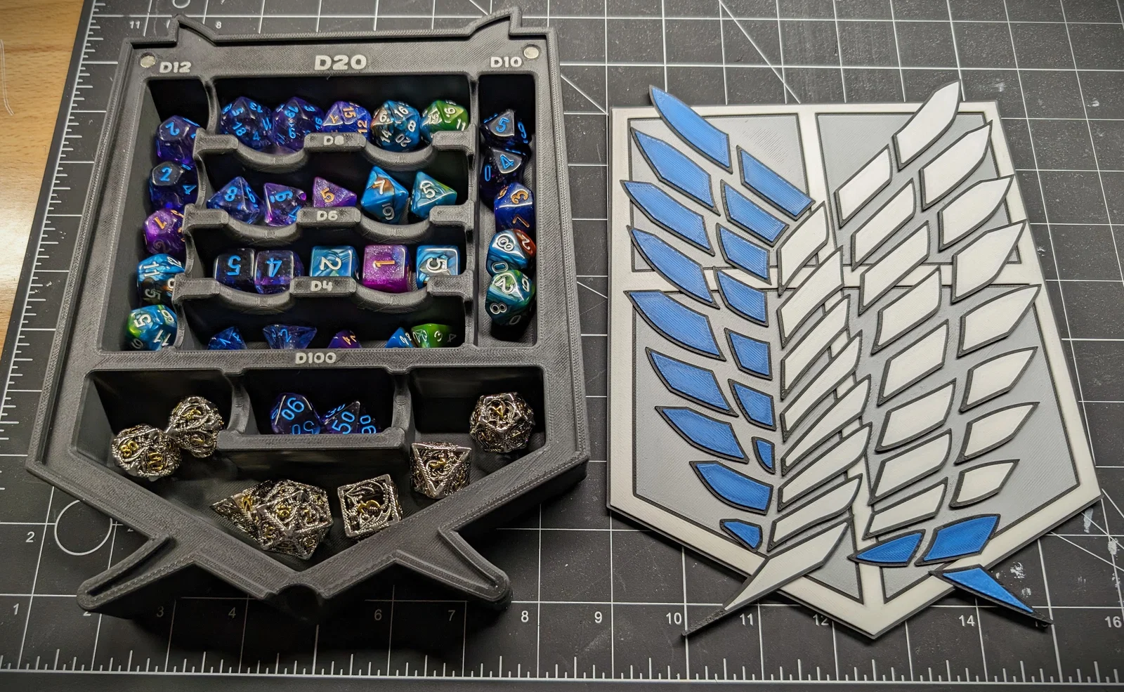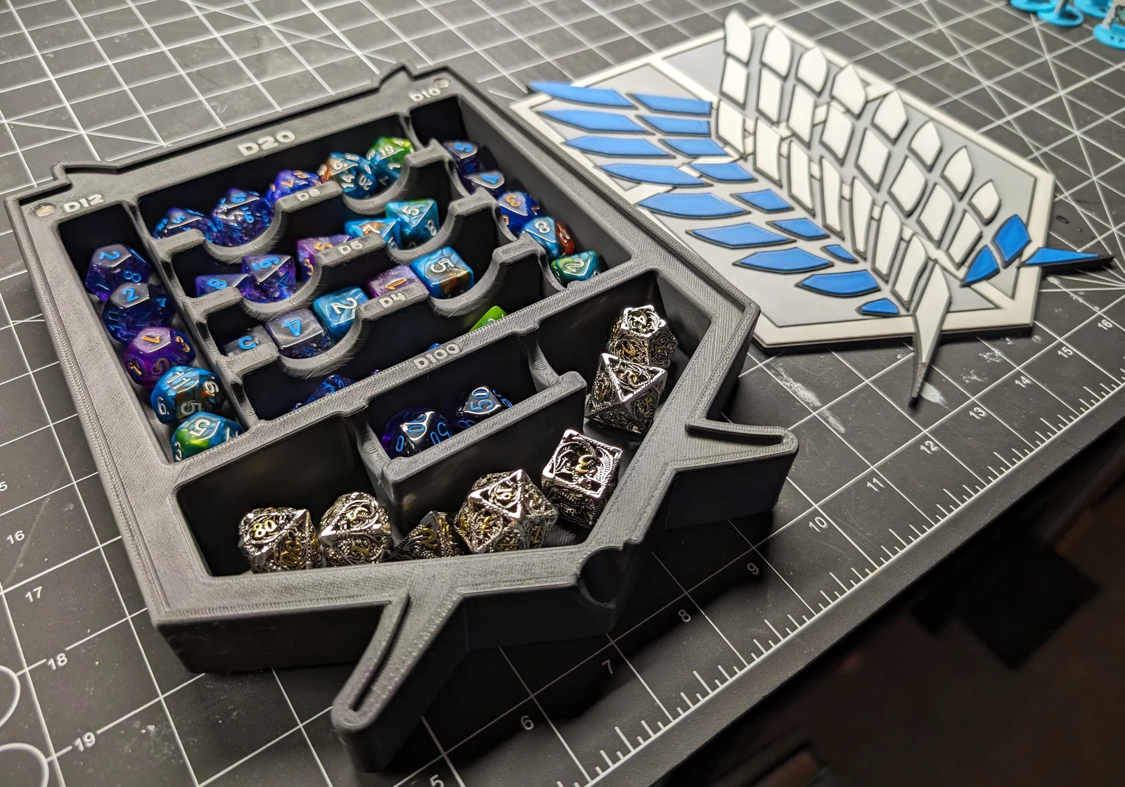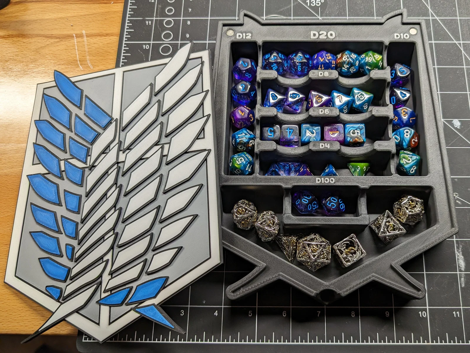 Hộp xúc xắc TTRPG lấy cảm hứng từ huy hiệu Scout Regiment (Survey Corps) trong Attack on Titan. Thiết kế chừa khoảng trống cho dice cỡ gần tiêu chuẩn, có hốc nam châm 6mm x 2mm và hỗ trợ đổi màu bằng solid body/3mf.