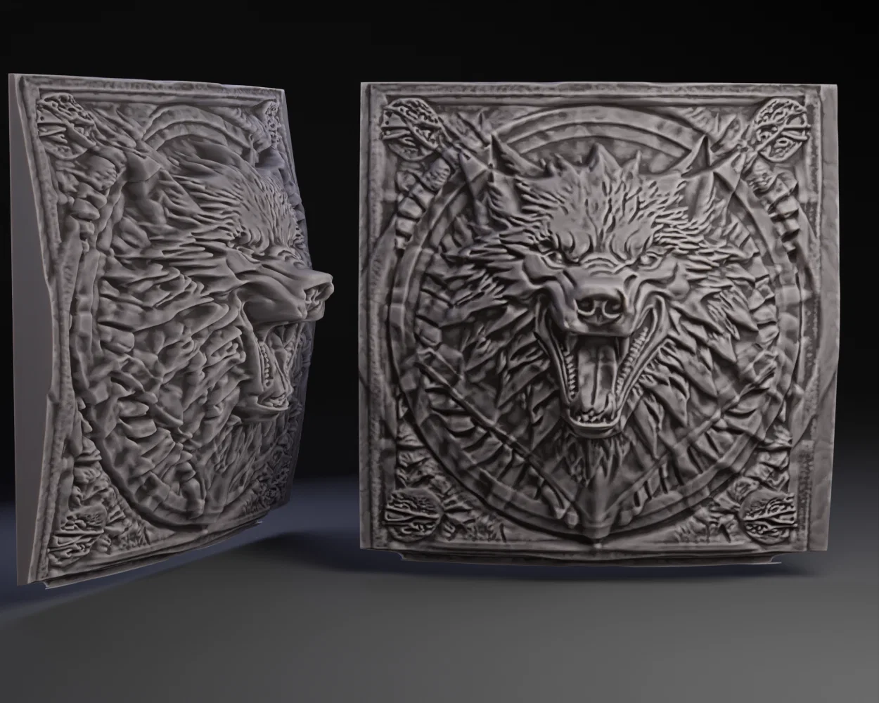 Mẫu Game of Thrones DireWolf Plaque: thử nghiệm displacement trên bề mặt cong sau khi remesh x10 octree. File bị “thất lạc” giữa nhiều project Blender đang chạy, rồi được phát hiện và hoàn thiện nốt.