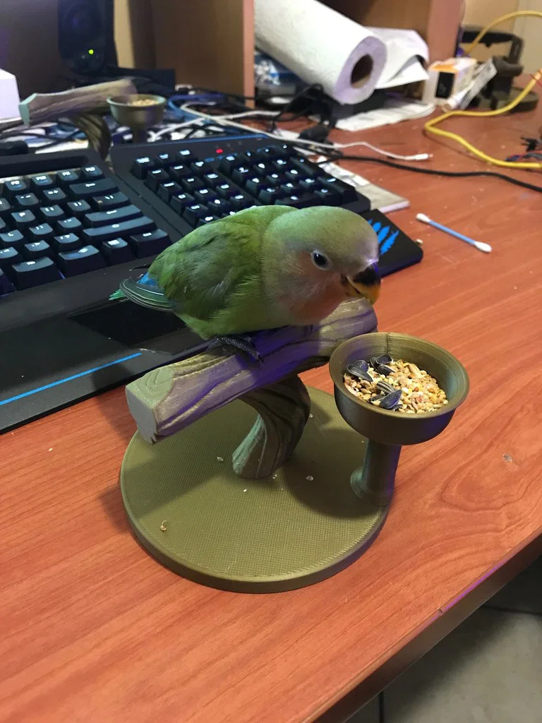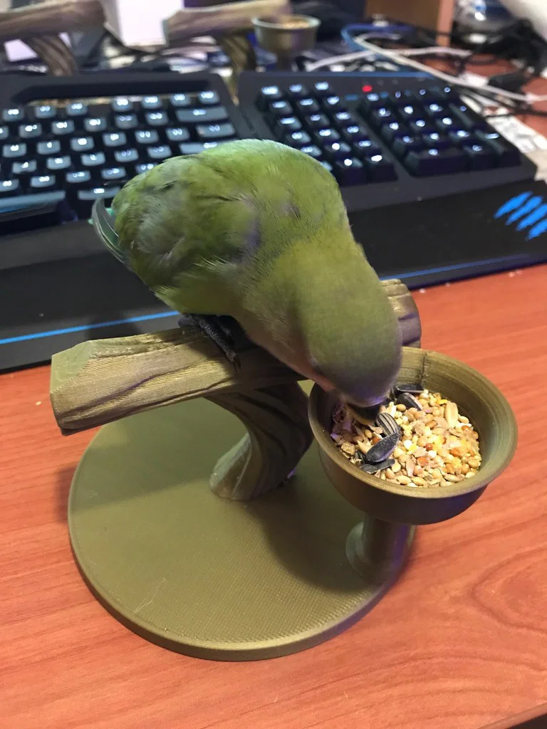 Chú lovebird mới nhà mình thỉnh thoảng hay thèm ăn vặt trong lúc tụi mình ngồi trước PC và thiết kế đồ in 3D. Lúc lướt thingiverse, tụi mình tình cờ thấy cái stand của Etta và Krummel cũng muốn một cái y chang, nhưng có thêm một bản mod.