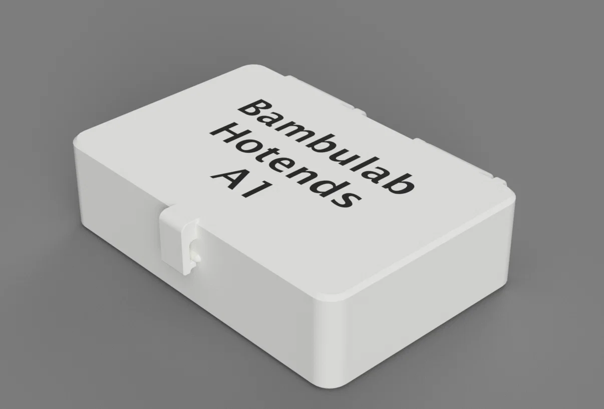 Hộp dùng để cất gọn 3 hotend kiểu Bambulab A1 dự phòng. Thiết kế bản lề snap-fit khớp khá chặt, khi lắp nên thao tác nhẹ tay. In bằng cách tách nắp và đáy, đặt mỗi phần nằm phẳng để in.