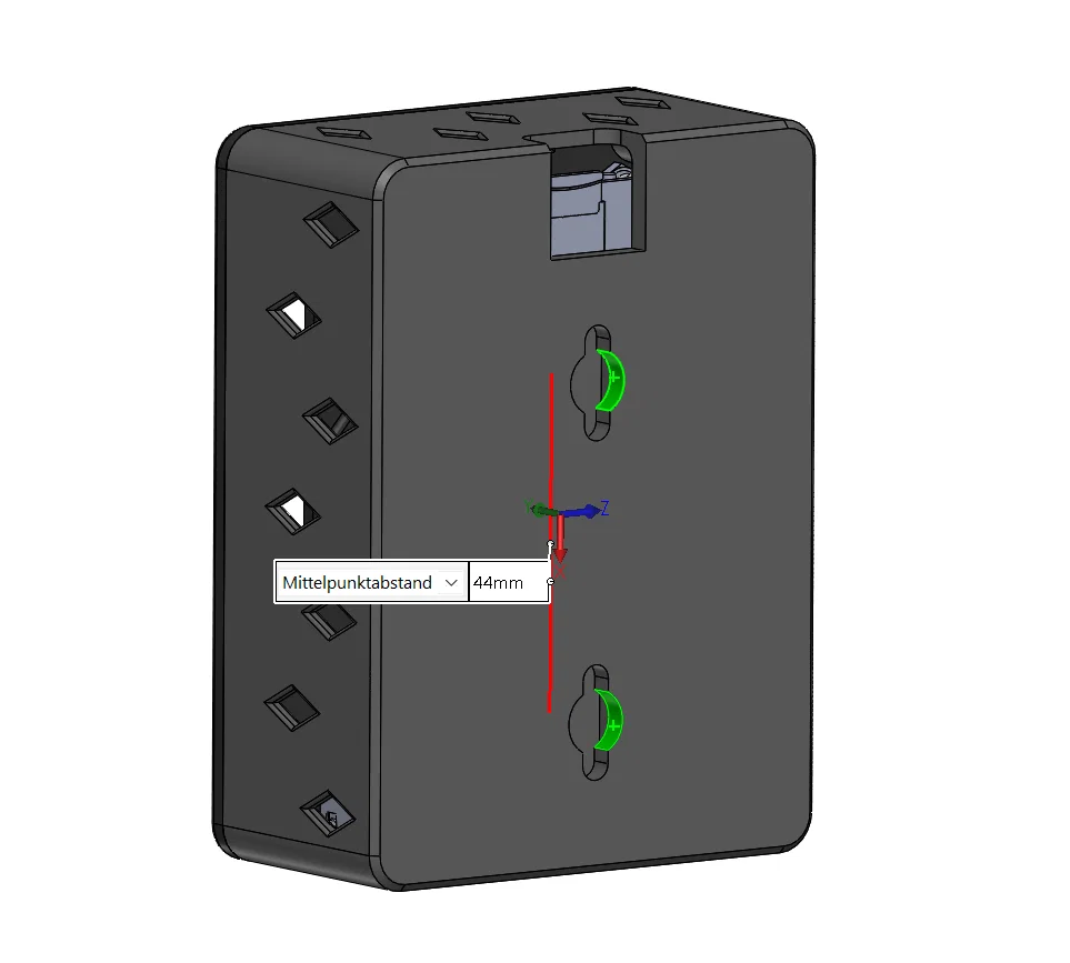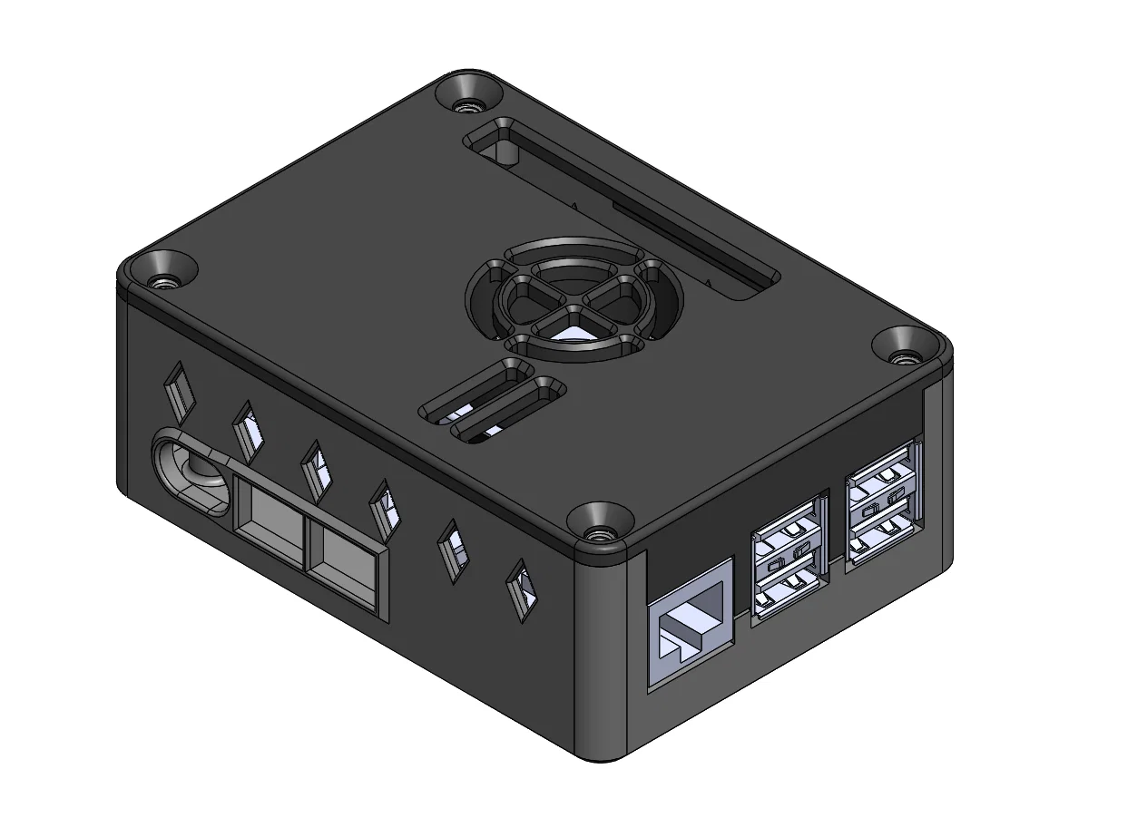 Đây là case Raspberry Pi 5 của mình, cho phép dùng Pi 5 trực tiếp với active cooler. Bên hông mình chỉ chừa một khe mở cho cổng nguồn và các cổng HDMI. Phía trên có các lỗ cho quạt, GPIO PINS và 2 đầu nối camera. Điểm đặc biệt là phía sau còn có thể treo case lên 2 con ốc. Khoảng cách giữa các lỗ là 44 mm.