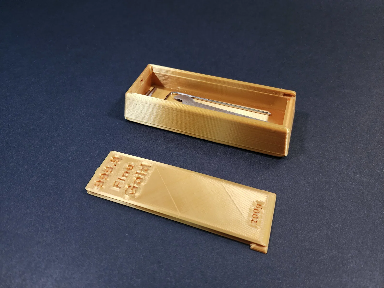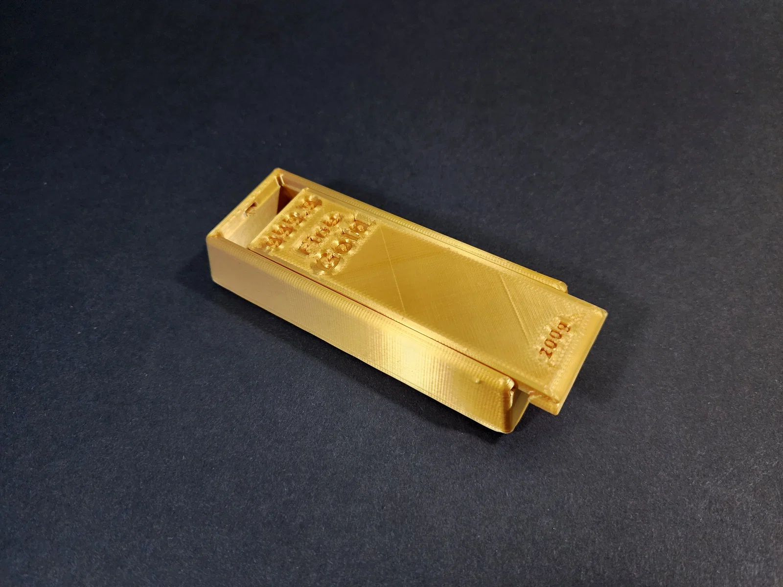 Đây là một hộp đựng đồ nhìn giống như một thỏi vàng. Hộp có nắp trượt và vừa cho bộ lục giác (Allen wrenches) cỡ nhỏ đến trung bình. File có kèm 2 phiên bản: một bản khe hở (tolerances) rộng hơn cho nắp trượt và một bản khe hở chặt hơn. Nếu máy in của bạn bị elephant's foot hoặc over extruding thì nên dùng bản “loose”. Còn lại thì bản “tight” dùng là ổn. In kèm supports.