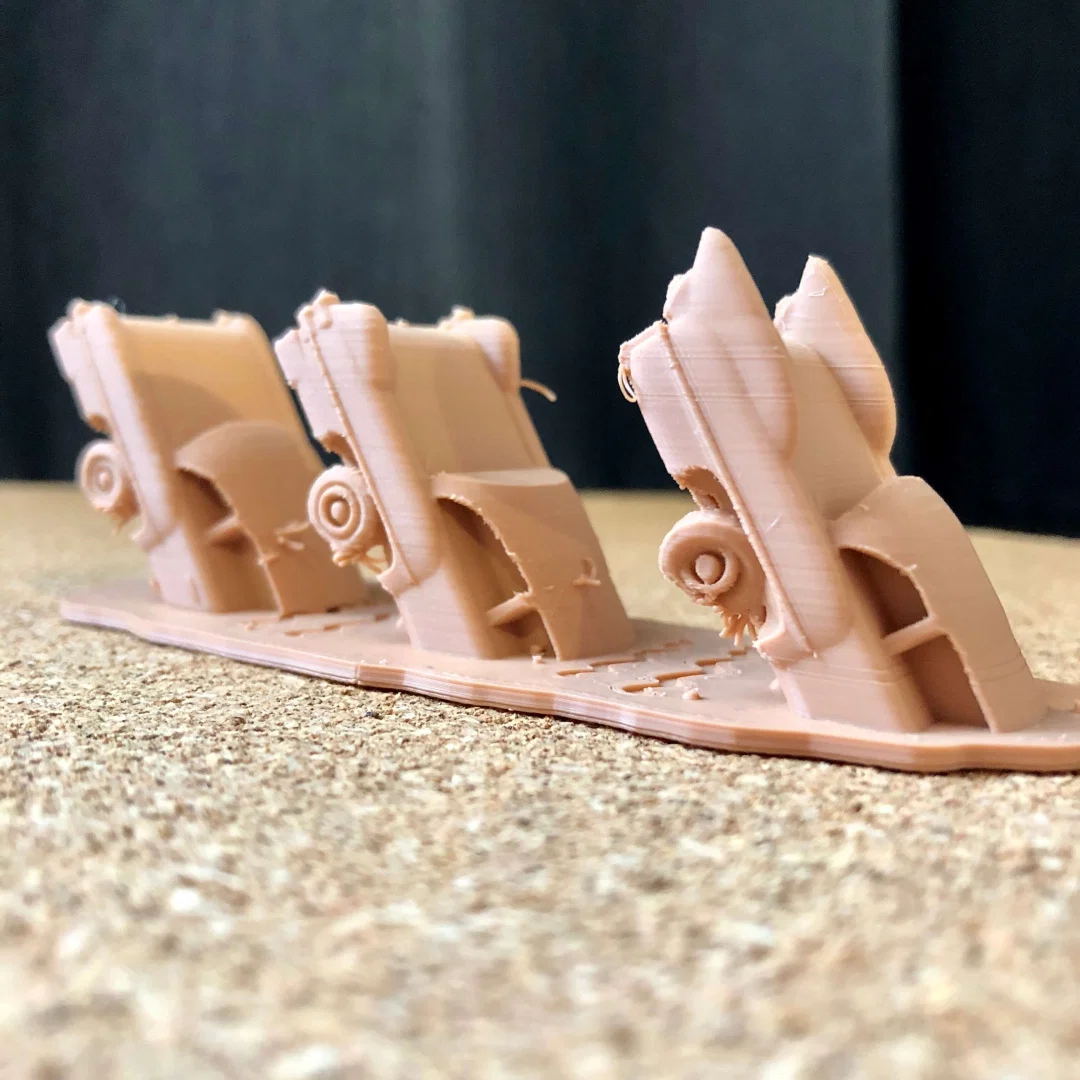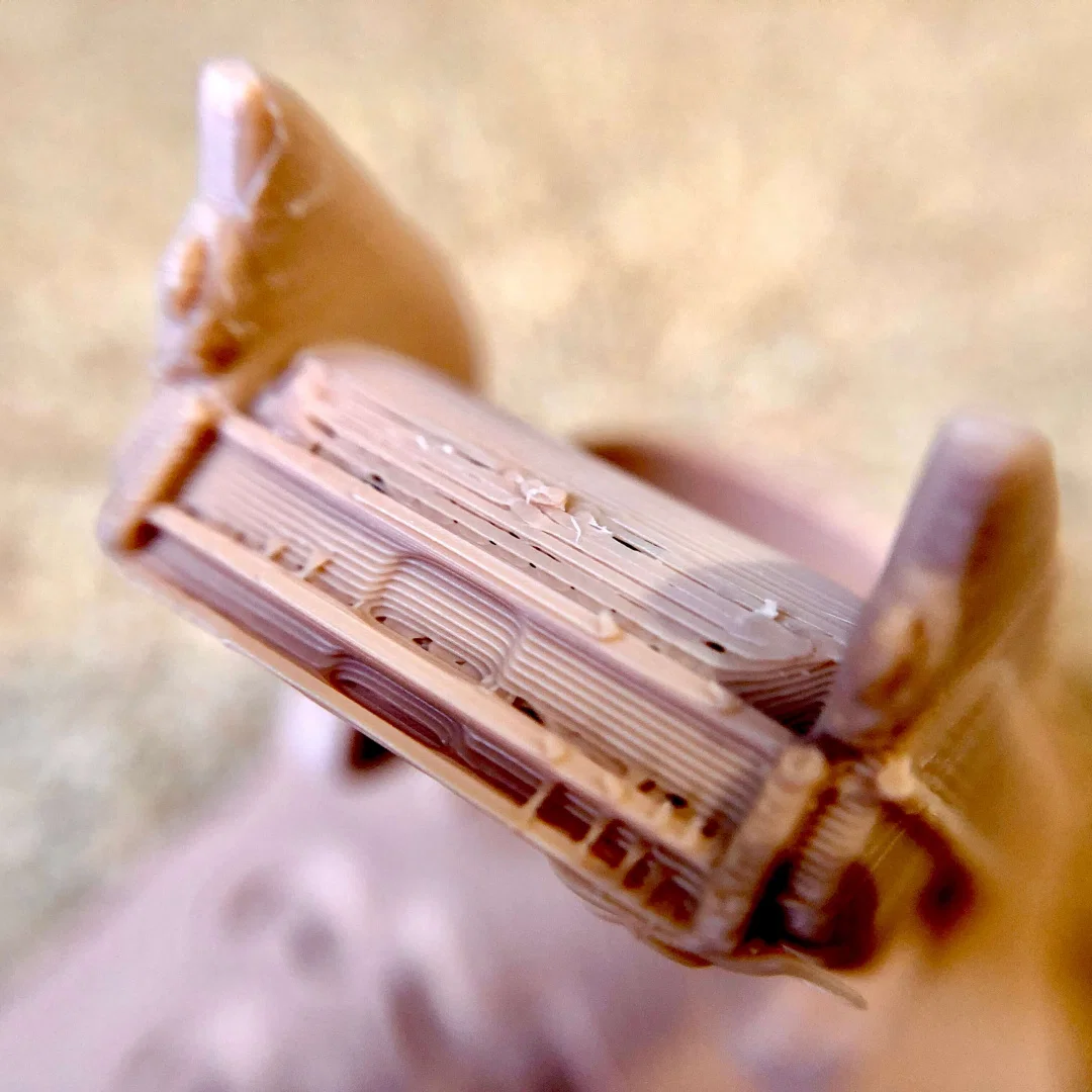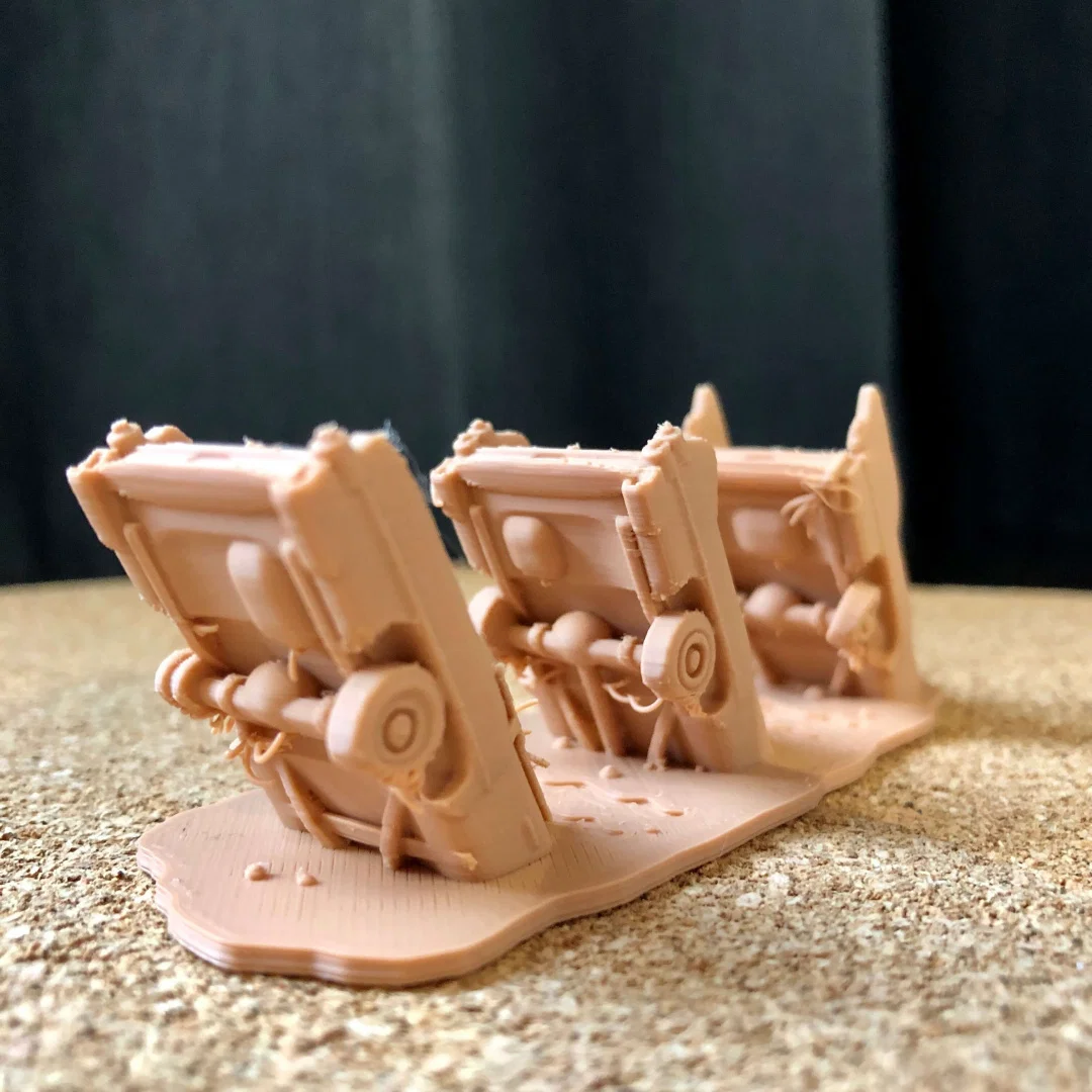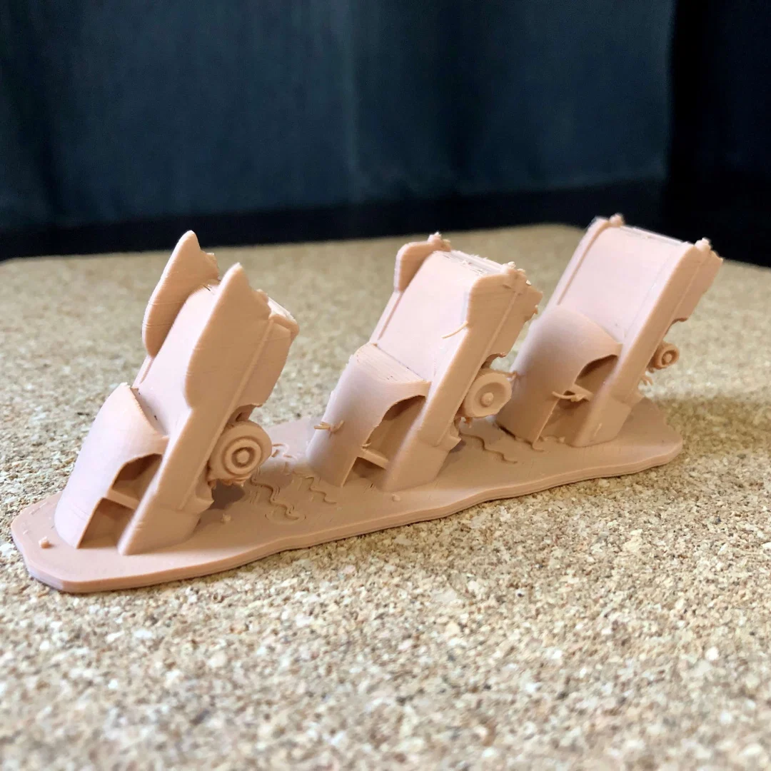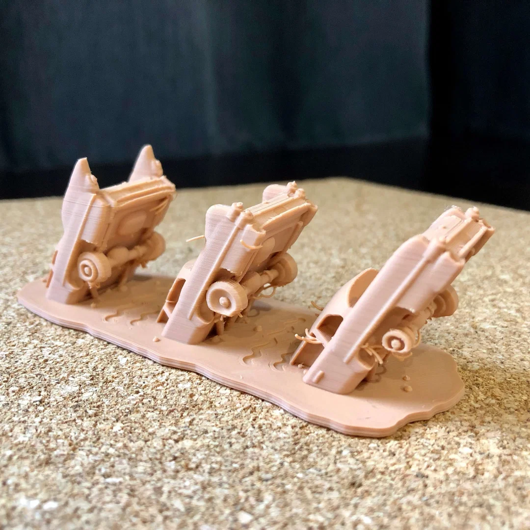 Bạn có thể dùng supports dưới bánh xe, nhưng không bắt buộc, tuỳ theo khả năng làm mát và thiết lập quạt. Nếu không dùng supports thì nhìn vẫn ổn, vì vài lỗi in nhẹ cũng giúp đúng chất “cũ nát/đổ nát”.