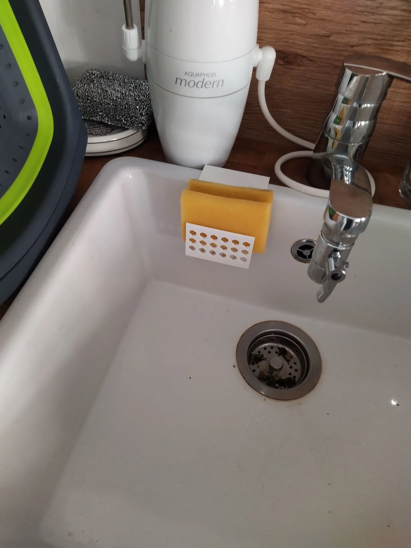 Giá treo miếng rửa chén móc lên viền bồn rửa, giúp giữ miếng sponge gọn gàng và nhanh khô. Nên thêm helper discs hoặc brim khi slice vì mẫu cao, footprint nhỏ; file FreeCAD chưa parametric hoàn toàn.