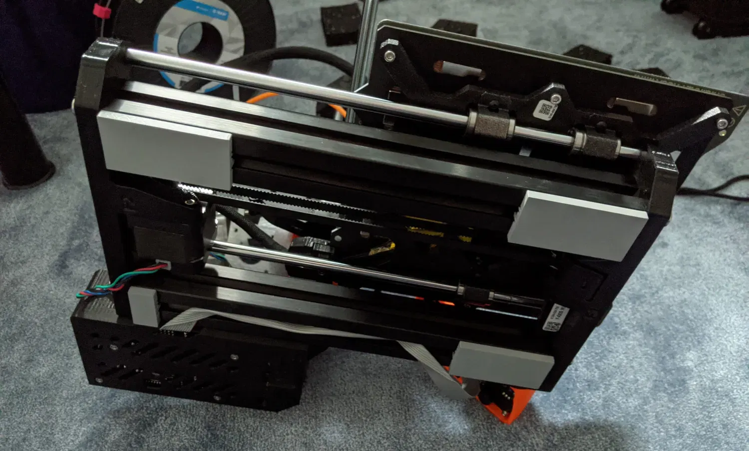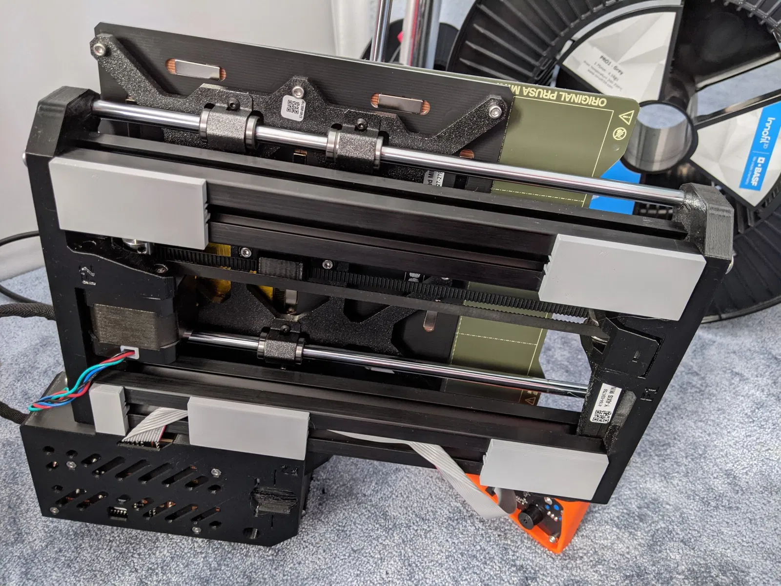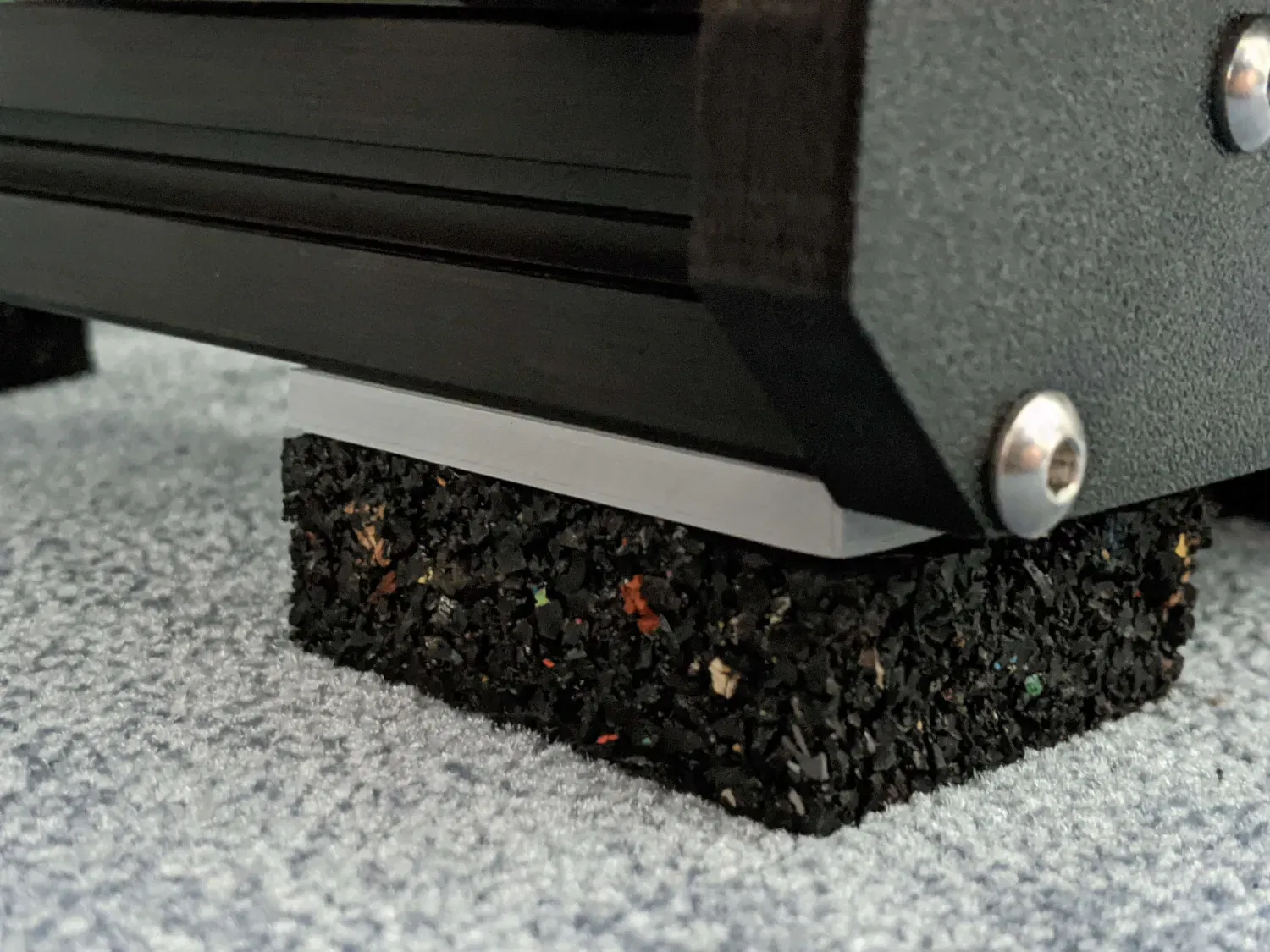 Cân bằng cơ sở Prusa Mini (khoảng cách 5mm giữa các profile 30x30 và hộp điện tử) để lắp đặt máy in trên thảm cao su chắc chắn/giảm chấn hoặc bất kỳ bề mặt phẳng nào. Thay thế các chân bọt dính.