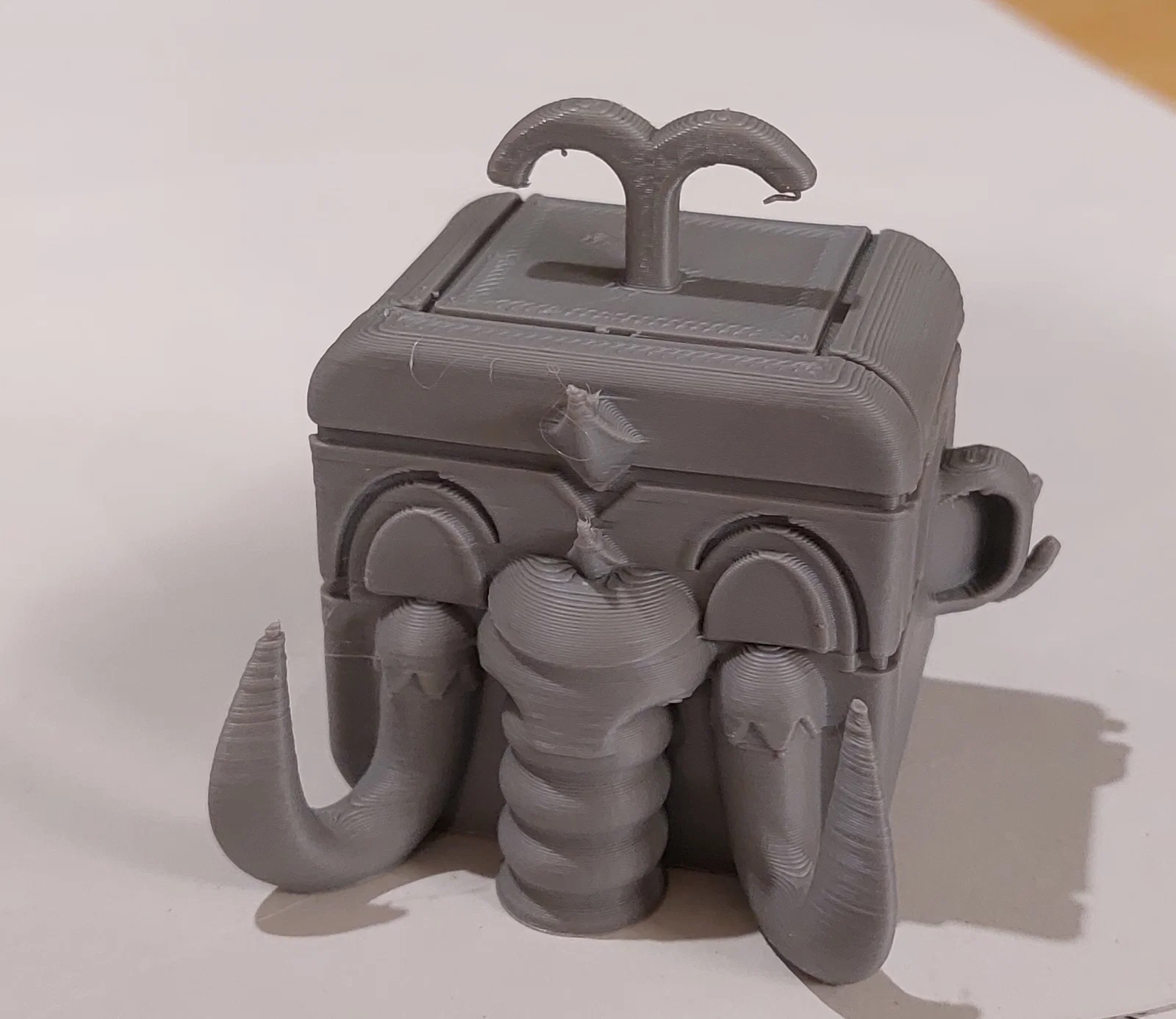 Mẫu 3D trái Mammoth trong Roblox Blox Fruit. Khuyến nghị in trên phần đế và dùng tree supports cho tai và anten trên đỉnh; các rãnh thường không cần support. Tác giả hài lòng và có thể tách STL anten do Cura thiếu support.