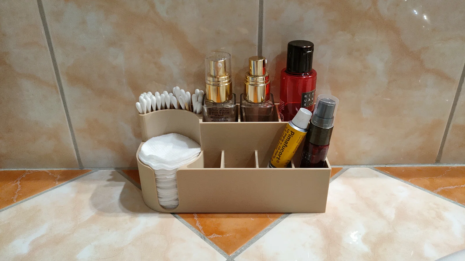 Sản phẩm được tối ưu hóa để có thể in 3D dễ dàng trên các dòng máy nhỏ gọn như Prusa MINI, giúp tiết kiệm không gian bàn làm việc hay kệ phòng tắm. Với thiết kế thông minh, ngăn chứa tròn ở một bên là nơi lý tưởng để đặt chồng bông tẩy trang, trong khi các ngăn vuông và hình chữ nhật còn lại rất thích hợp cho son dưỡng, lọ serum hoặc tăm bông. Bạn có thể đặt nó ngay cạnh gương soi để tận dụng tối đa tiện ích hàng ngày, giúp không gian gọn gàng và thẩm mỹ hơn hẳn.