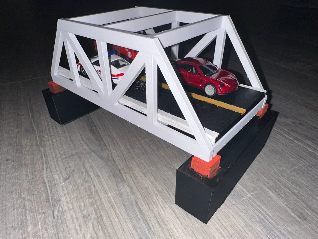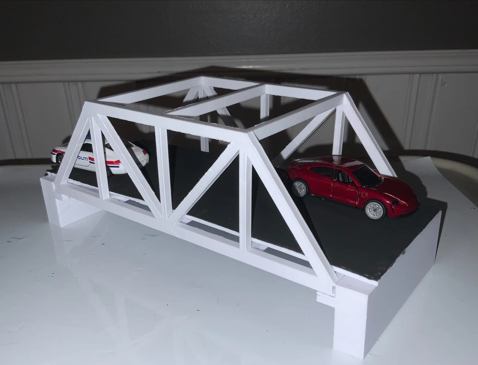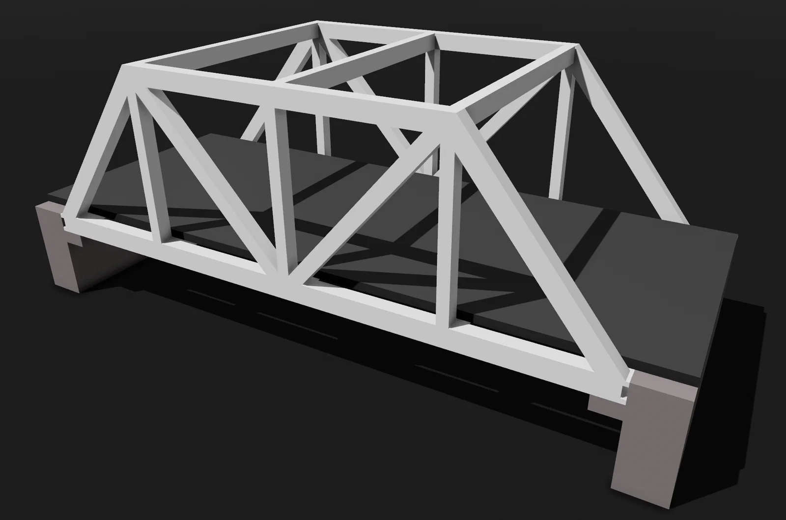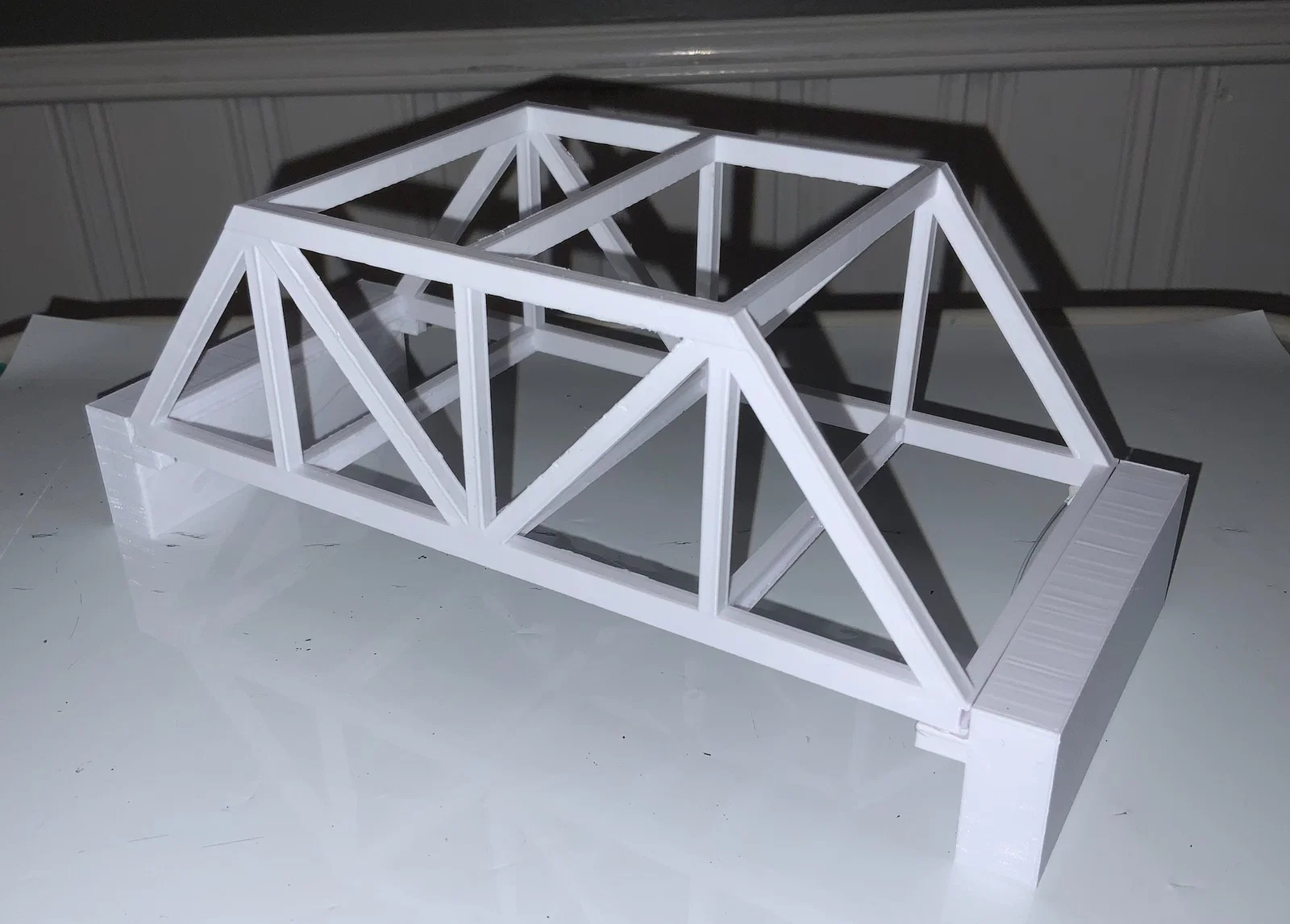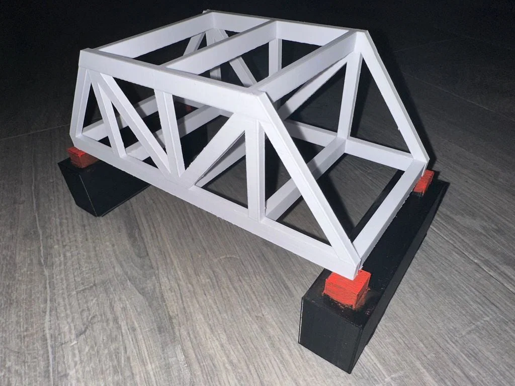 Mẫu truss bridge (cầu giàn) được đơn giản hoá để dễ 3D print. Lưu ý hình đầu chỉ mang tính minh hoạ, mẫu in thực tế có biên dạng được nhấn mạnh và tối ưu để in thuận tiện hơn.