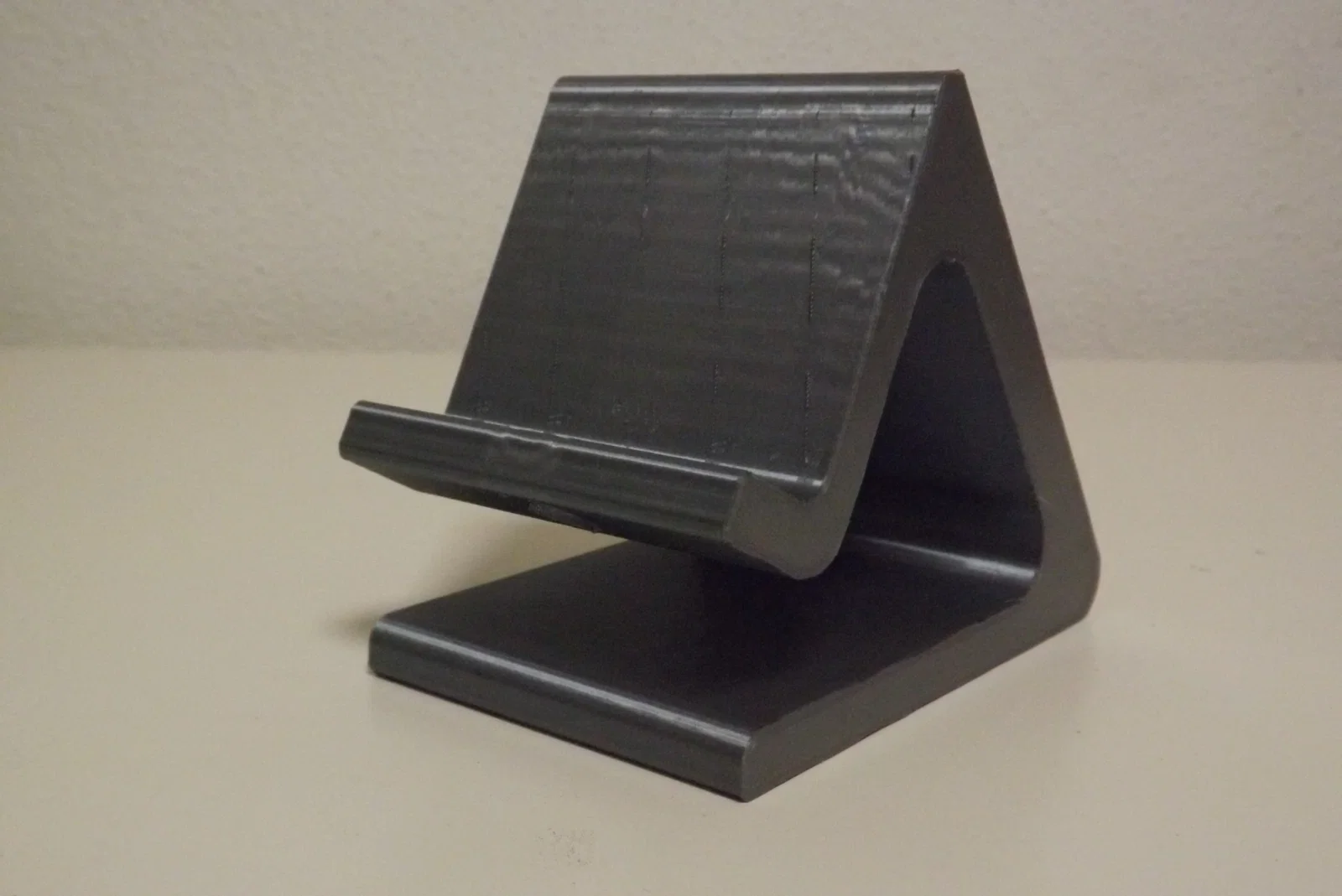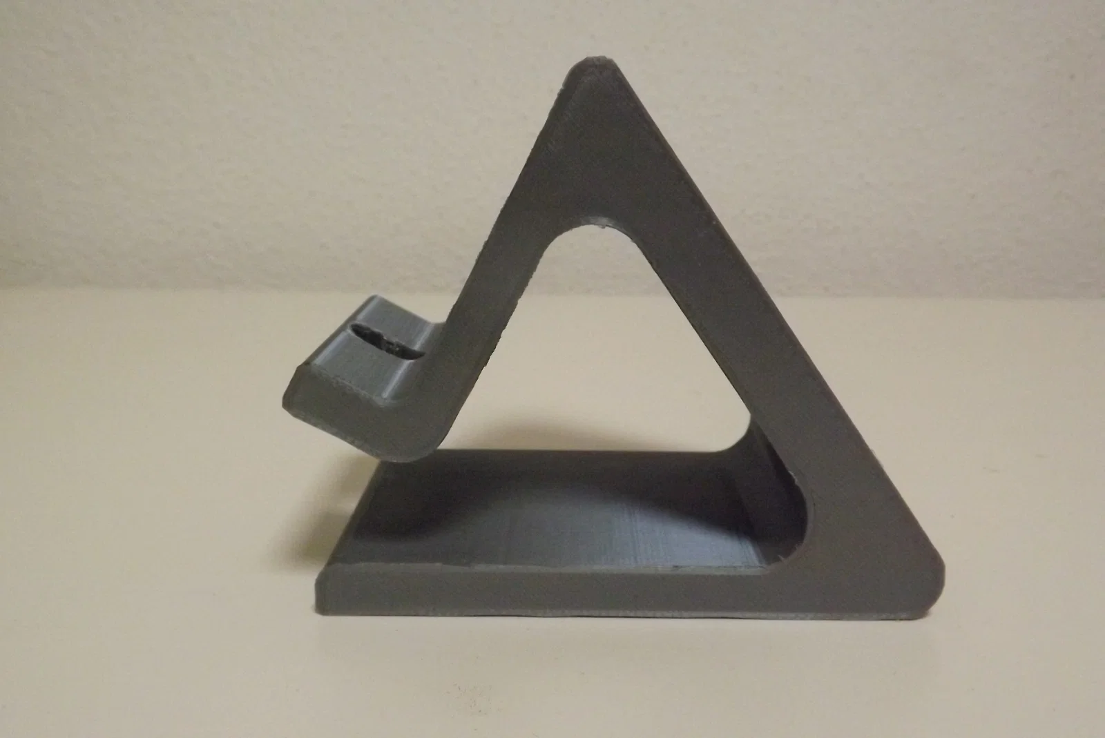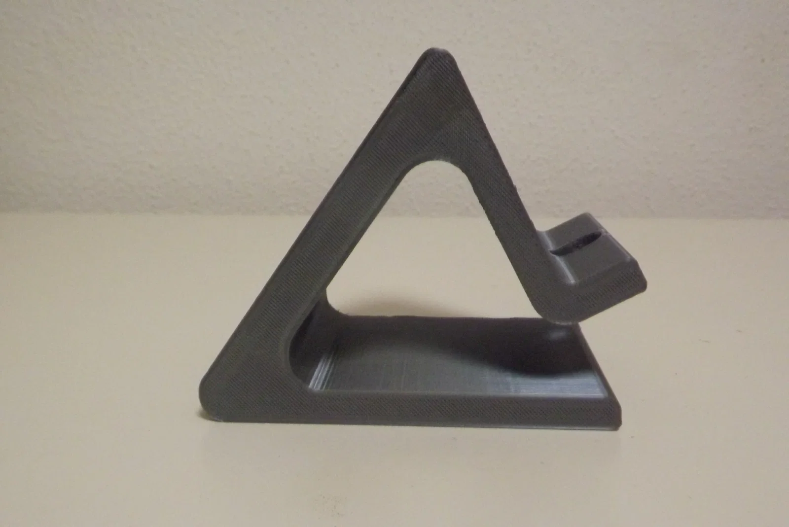 Giá đỡ điện thoại in 3D bằng PLA có lỗ sạc, in ở 200°C với layer height 0,2. Kèm 2 miếng đỡ tam giác dán tùy độ dày máy, giúp giữ chắc, chống trượt và hạn chế rơi khi đang sạc.