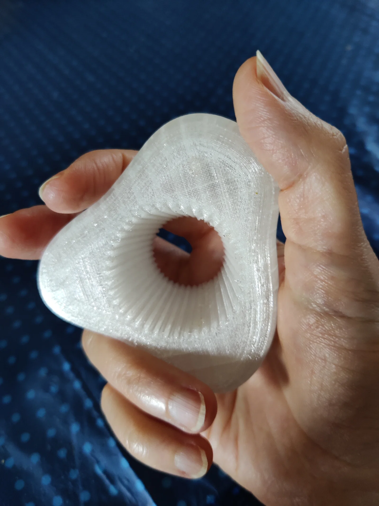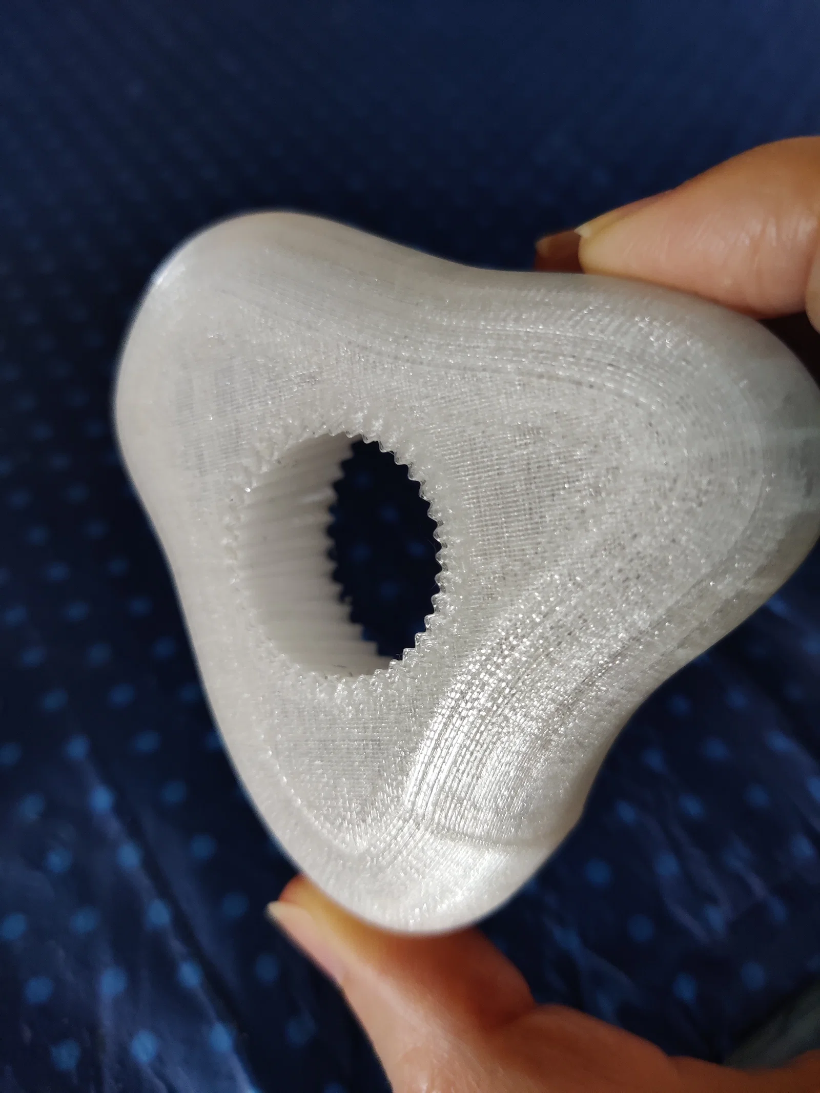 Hình dạng gần như tam giác bo tròn, không có cạnh hay chi tiết sắc nhọn, nên rất phù hợp cho trẻ em hoặc người có nhiều dạng khuyết tật về tinh thần hay thể chất. Bạn có thể in lớn/nhỏ hơn khoảng 10–20% mà vẫn giữ được công năng, để hợp với tay nhiều kích cỡ khác nhau.