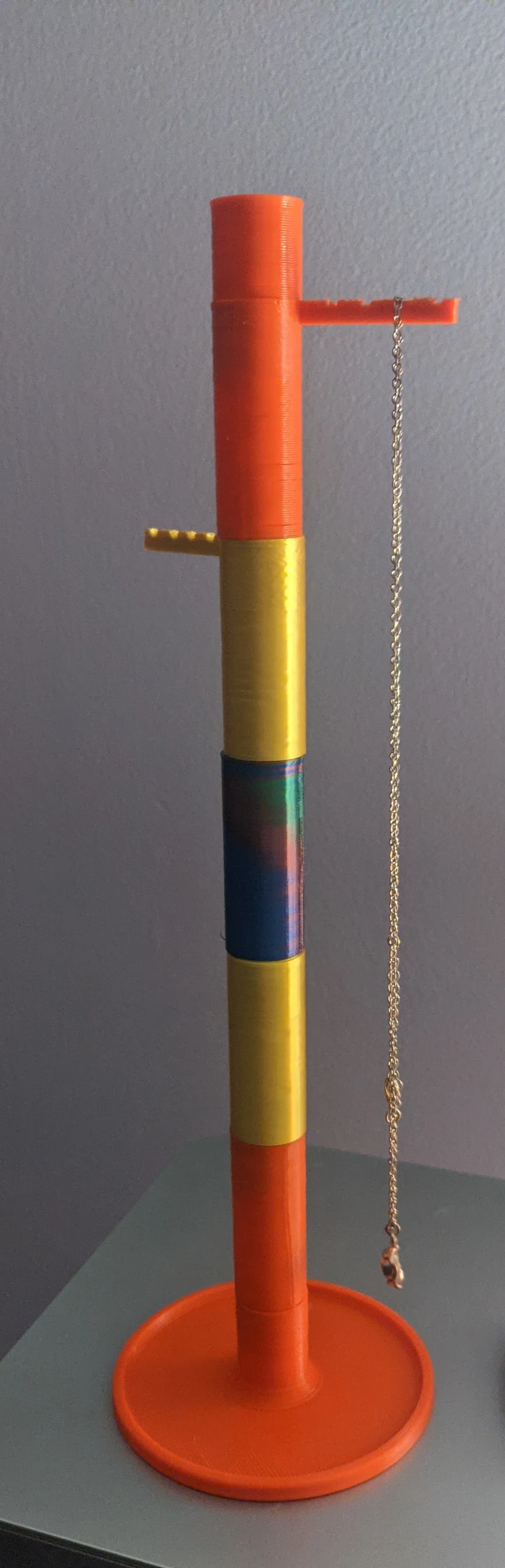 Kệ trang sức dạng modular, muốn cao bao nhiêu thì ráp thêm bấy nhiêu. Chỉ cần máy in 3D nhỏ cũng in được. In base, riser (ngắn/dài), riser có nhánh và tùy chọn gắn cap lên trên.