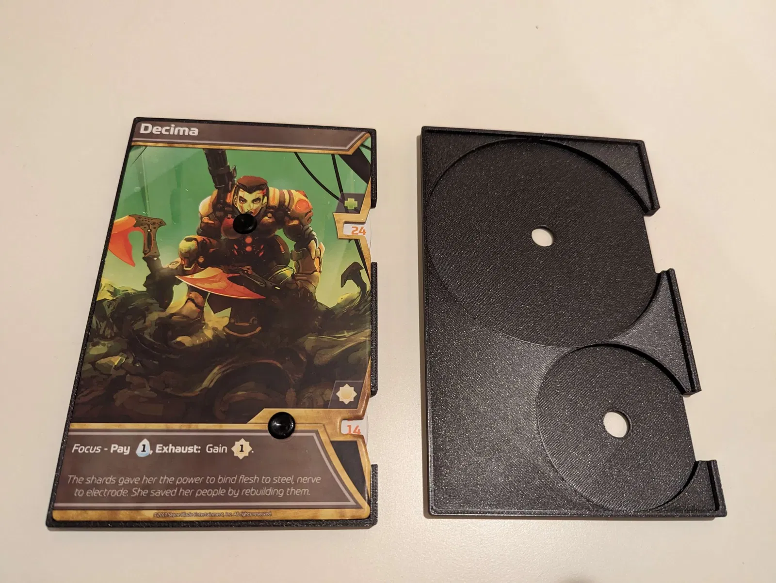 Tôi đã cảm thấy khó chịu vì các thẻ nhân vật/thẻ đếm điểm trong Shards of Infinity không nằm phẳng trên bàn, vì vậy tôi đã làm một cái chèn nhỏ. Các thẻ rất vừa vặn nhưng các đếm thì quay tự do. Tôi nhận thấy ít nhất một thẻ trong bộ của tôi có đường cắt xấu và tôi đã phải cắt một bên để cho nó vừa. Tất cả 4 thẻ nên vừa trong hộp với những cái chèn này.