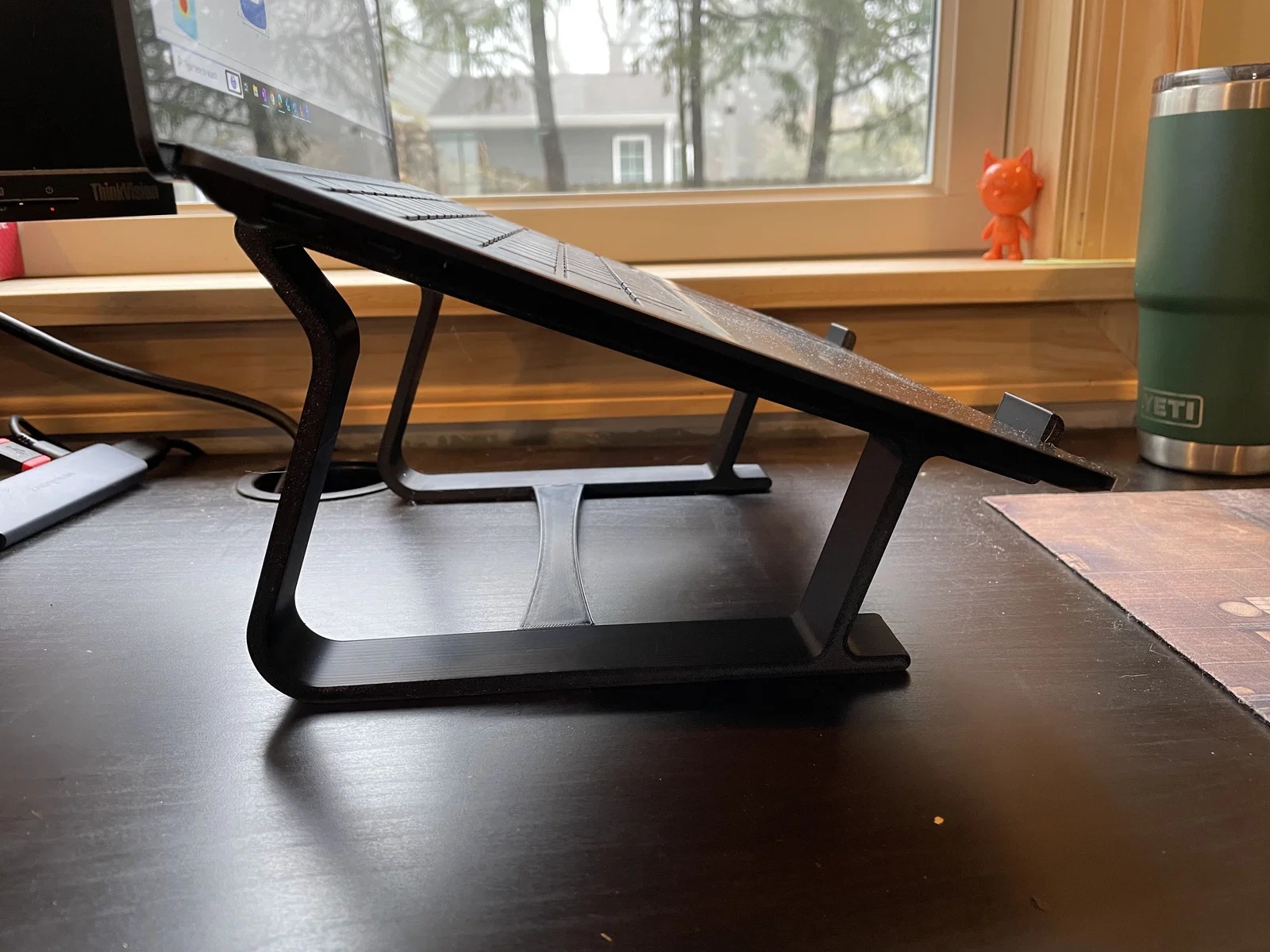 Kết cấu rất đơn giản, dựa trên thiết kế gốc của JannesV. In từng phần rồi dán keo lại với nhau (hoặc nếu in bằng ABS thì có thể “weld” bằng acetone). Mình rất thích thiết kế gốc, nhưng thấy laptop của mình bị chòng chành/dễ lật nếu mình ngửa màn hình ra sau quá nhiều hoặc bấm các phím ở hàng trên cùng (máy mình đang dùng có chiều sâu lớn hơn so với kích thước mà thiết kế gốc nhắm tới).