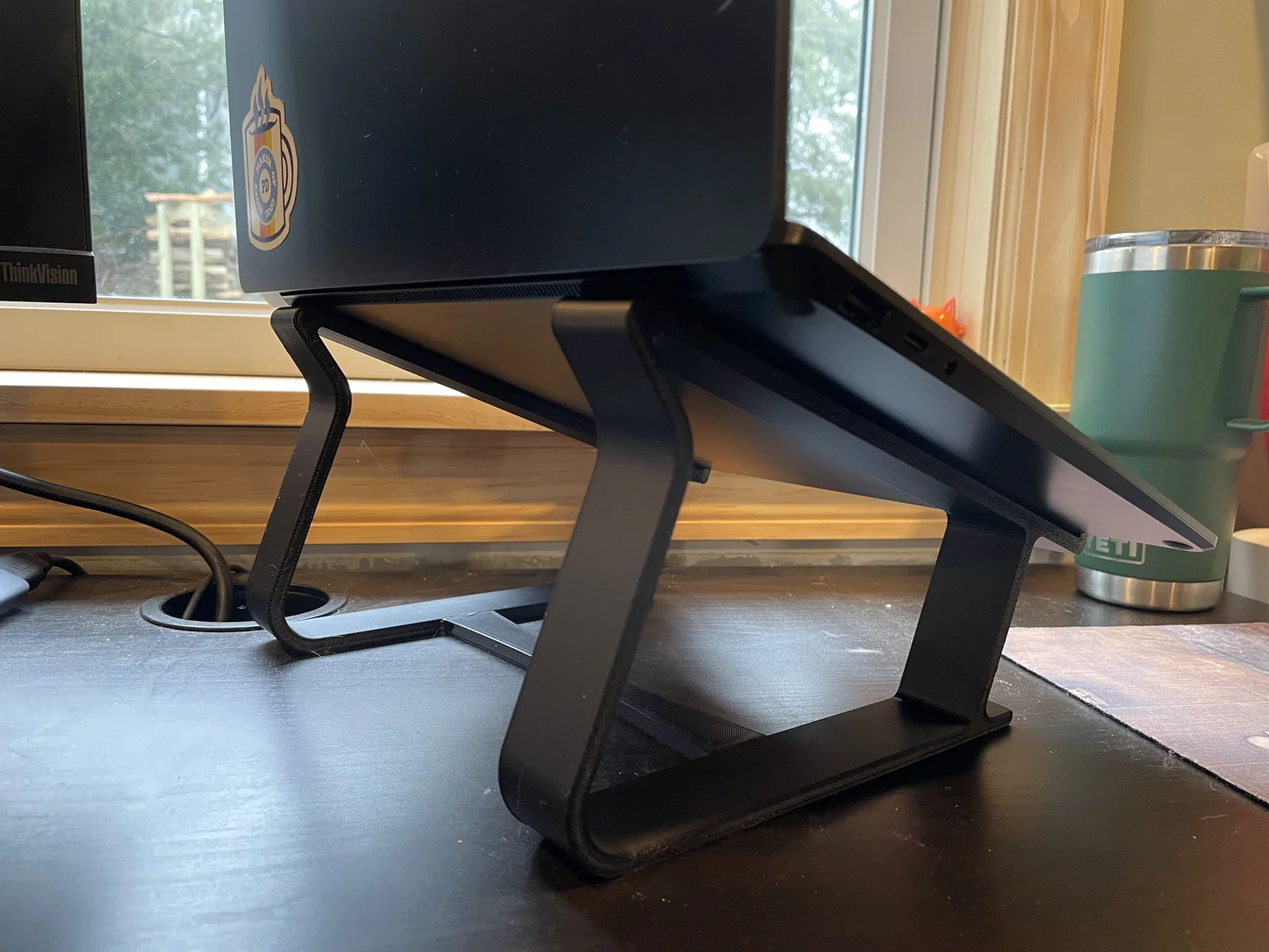 Kệ đỡ laptop bản sâu hơn, chỉnh từ thiết kế gốc của JannesV để hợp T-Series và nhiều laptop phổ thông. In từng phần rồi dán keo; nếu in ABS có thể hàn bằng acetone để chắc hơn.