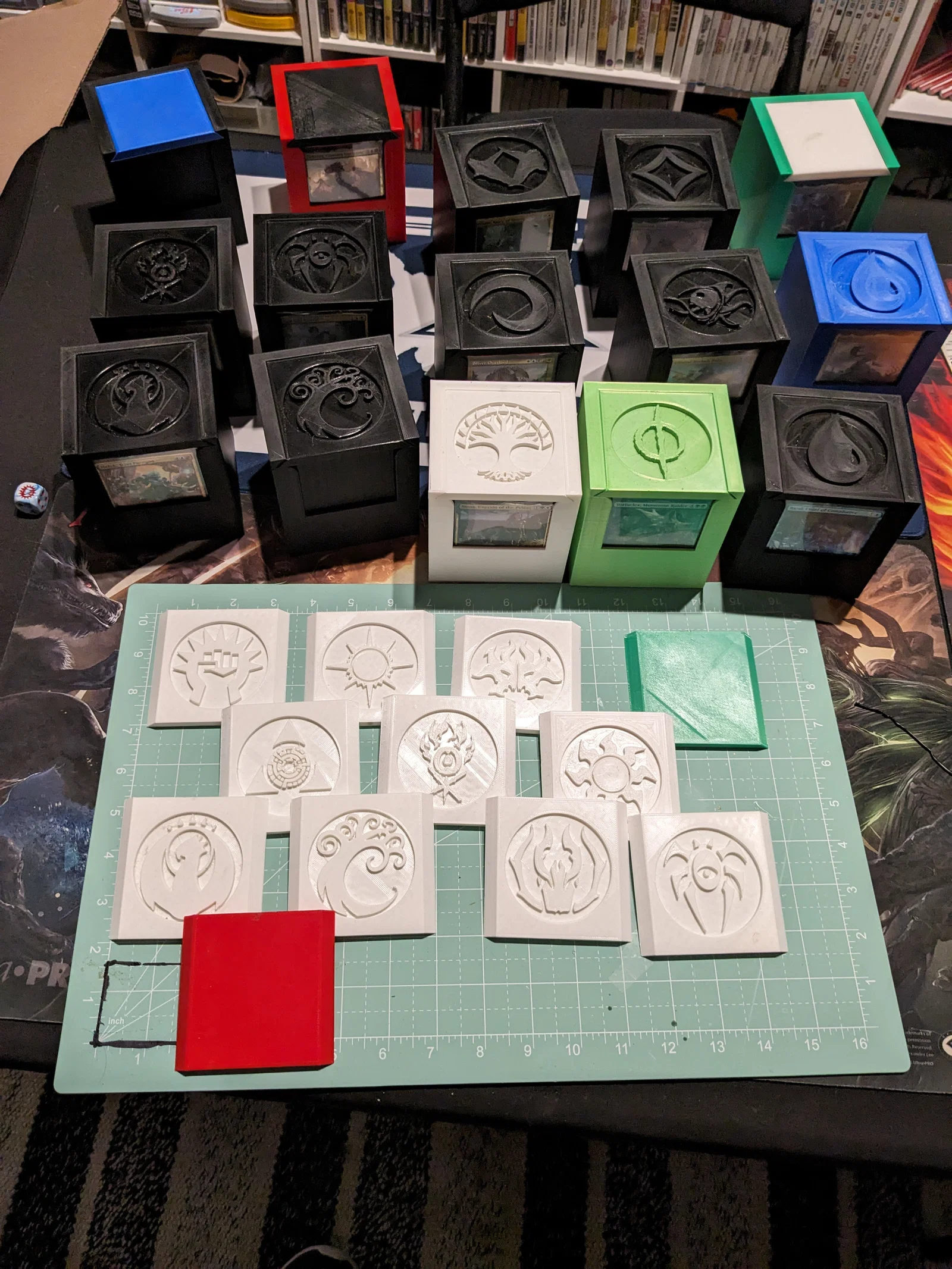 Hộp đựng bài MTG cho Commander deck (hơn 100 lá đã bọc sleeve), có khe view port để thấy lá commander. Nhiều tuỳ chọn nắp: Solid, Mono, Guild, Shard, Themed; nắp in 1 mảnh hoặc 2 mảnh, dùng nam châm 5×2mm.