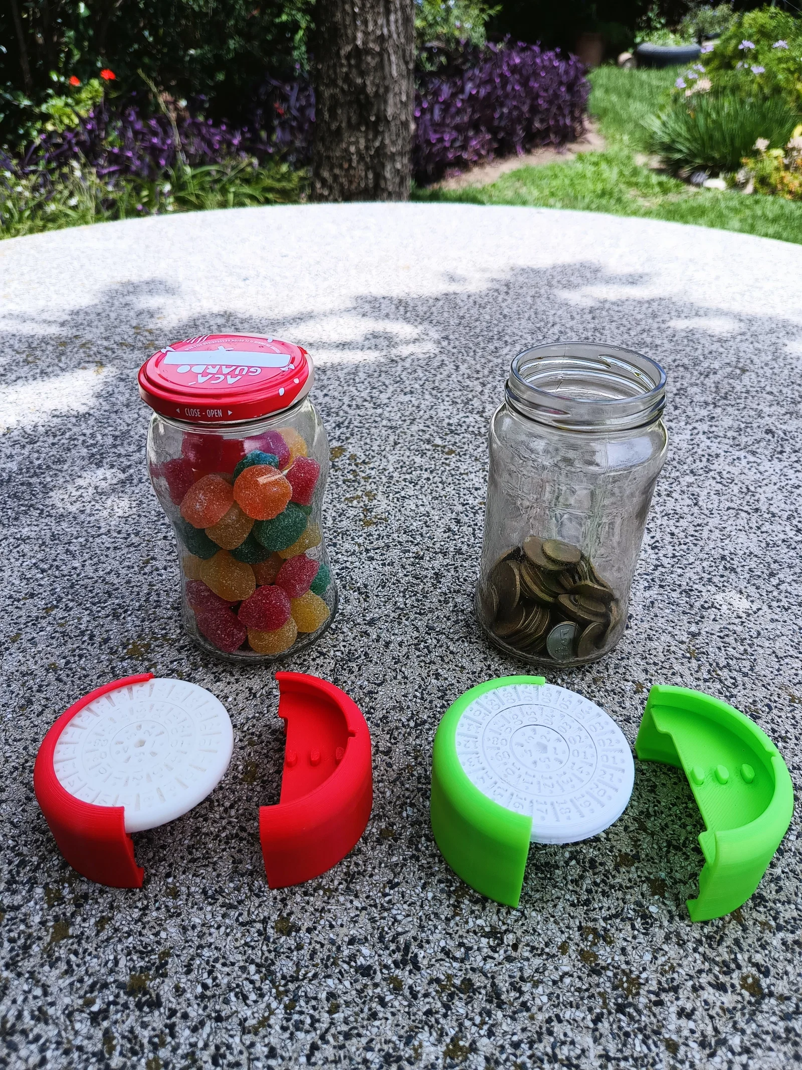 Để thiết kế này có tính ứng dụng sau khi chơi chán, mình đã làm cho nó vừa vặn với nắp hũ mứt tiêu chuẩn như trong hình. Vì mình đã dồn khá nhiều tâm huyết vào ổ khóa đồ chơi này (và rất ưng ý kết quả cuối cùng) nên quyết định chia sẻ cho mọi người. Mình coi đây là thiết kế gốc vì đã bổ sung nhiều cải tiến (đặc biệt là khả năng đổi mã, cộng thêm một vòng xoay phụ).