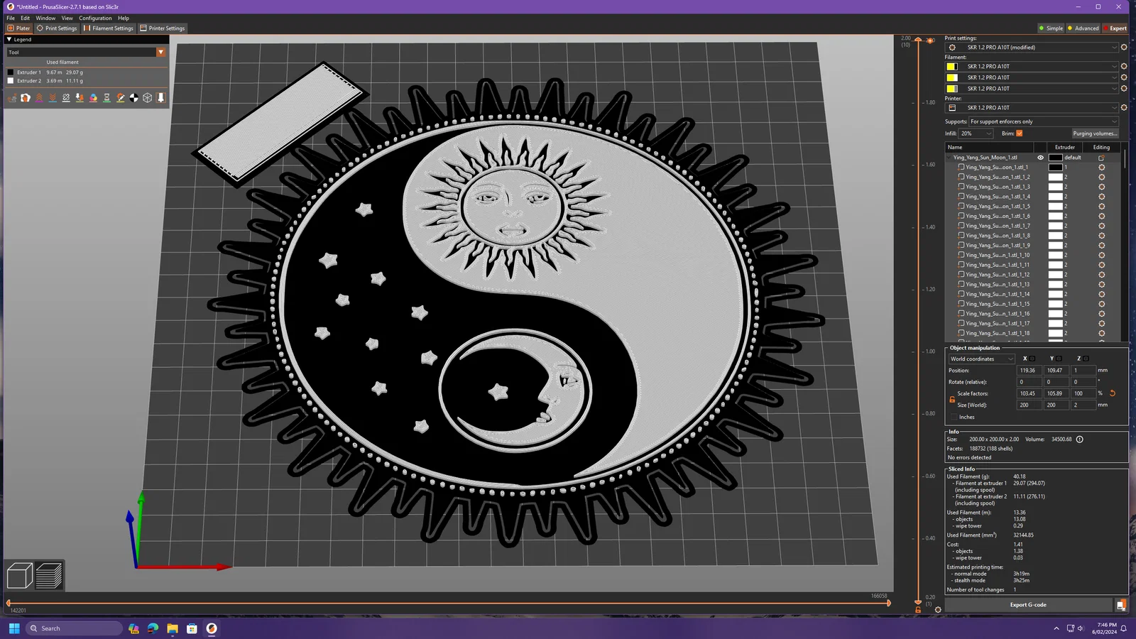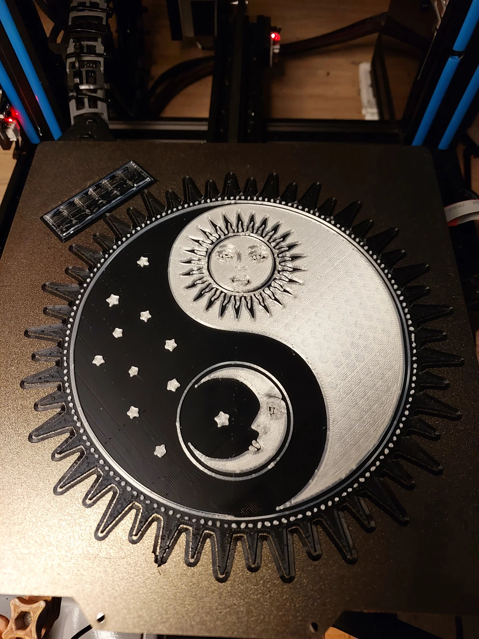 Mẫu Yin Yang Sun & Moon 1 dạng treo tường, kích thước 200×200mm, dày 2mm, in khoảng 4 giờ. Có hướng dẫn in 2 màu cho máy multi extruder và cách pause (M25) cho máy single extruder.