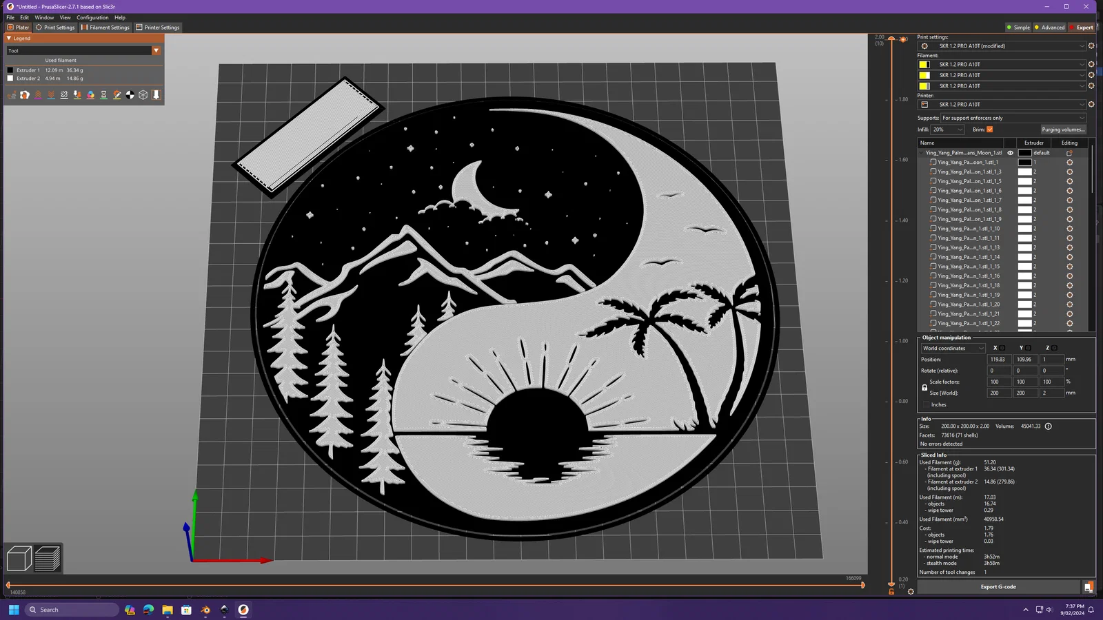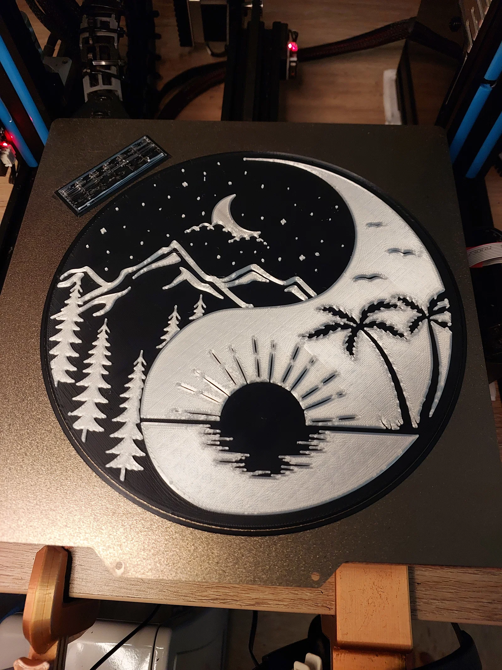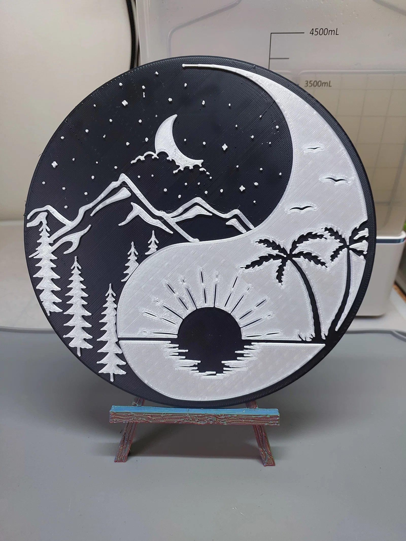 Mẫu wall art “Palm Tree Mountains Moon Yin Yang” phong cách Yin Yang, kích thước 200×200mm dày 2mm, dễ in. Hướng dẫn in cho cả máy multi extruder và single extruder (pause bằng G-Code M25 trên Marlin2).