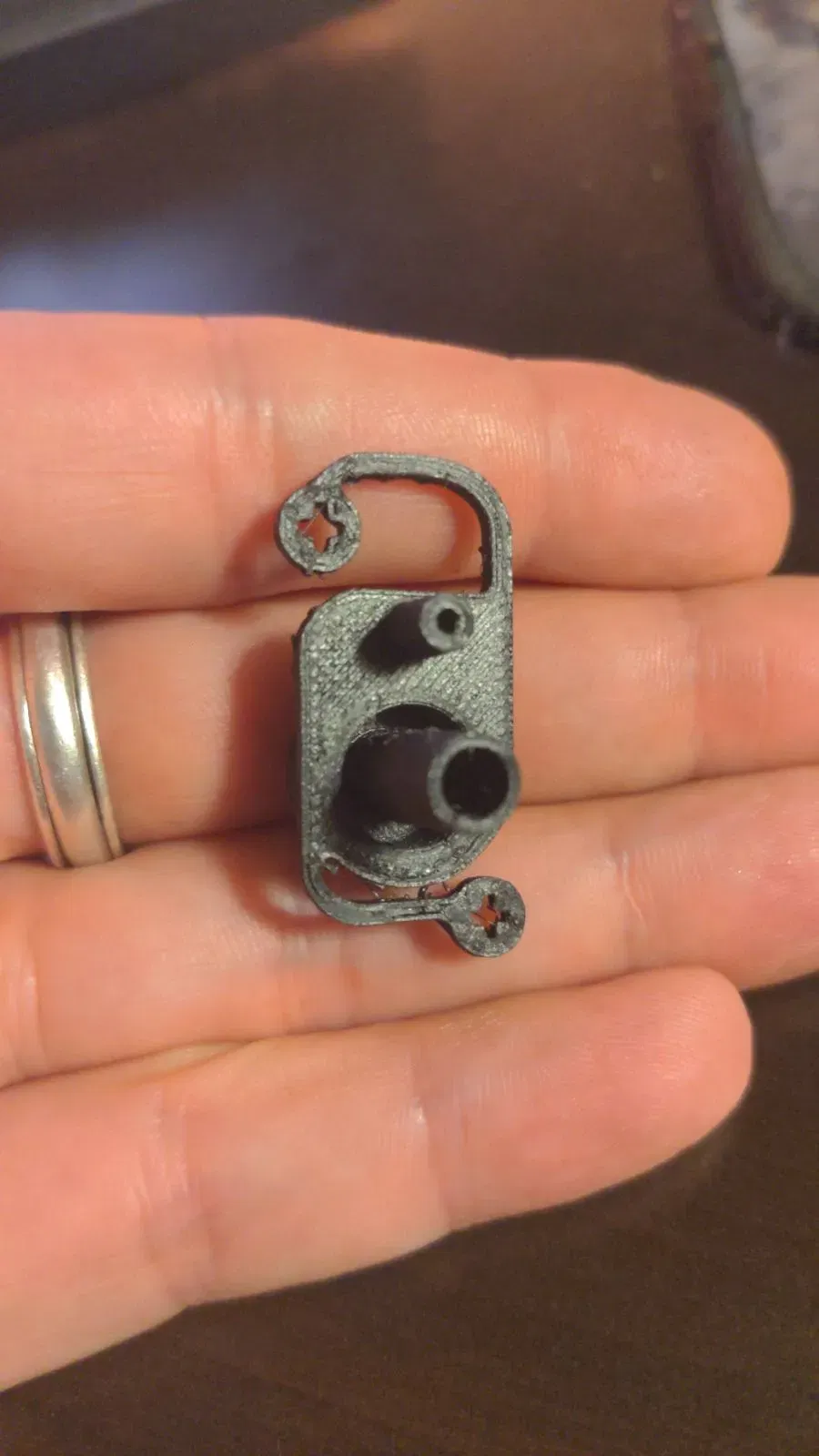Đó là một bộ phận khá nhỏ, và việc in với độ phân giải cao được khuyến nghị vì nó làm tăng số lớp trên hai cánh tay gắn kết. Các điểm tiếp xúc trên và dưới bao gồm các lỗ chéo được thiết kế để vừa khít trên các điểm gắn chéo của bảng điều khiển phía trước. Một vài giọt keo dán siêu mạnh là đủ để gắn chắc chắn.
