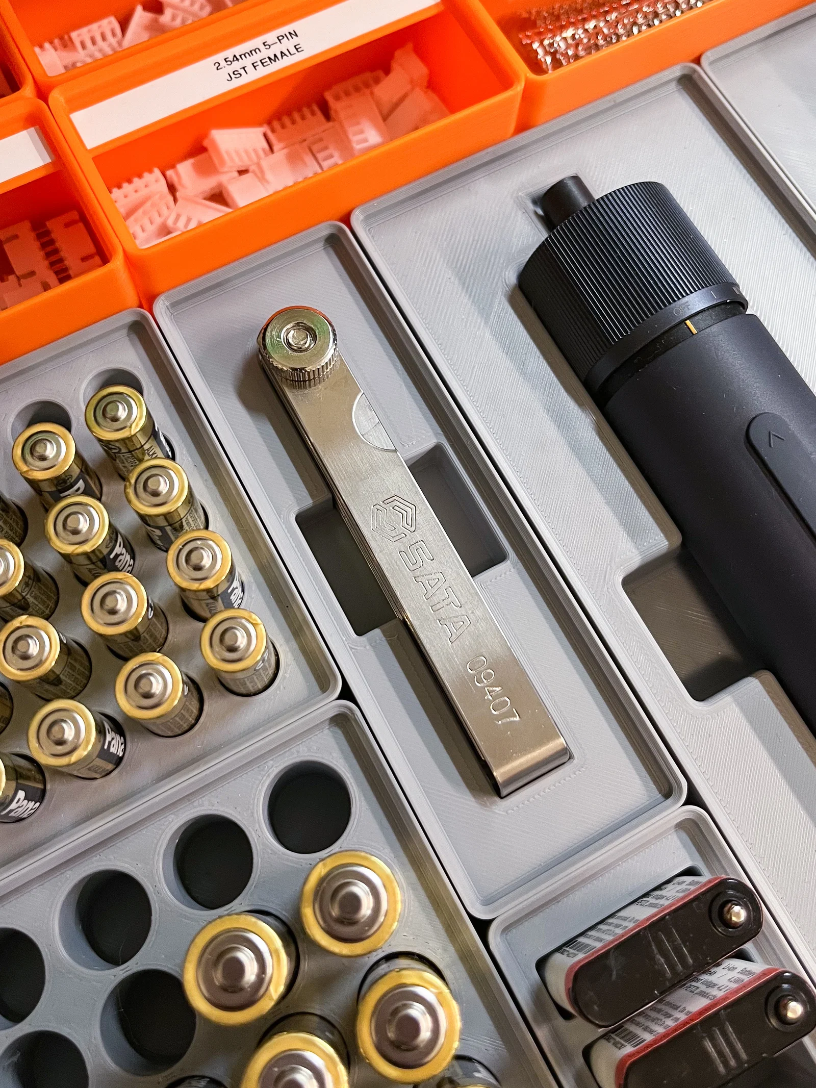 Khay Gridfinity (1x3x4) thiết kế để đựng gọn bộ thước lá SATA 32 chi tiết mã ST09407SJ. Phù hợp sắp xếp trong hệ Gridfinity, dễ lấy ra cất vào khi đo khe hở/hiệu chỉnh.