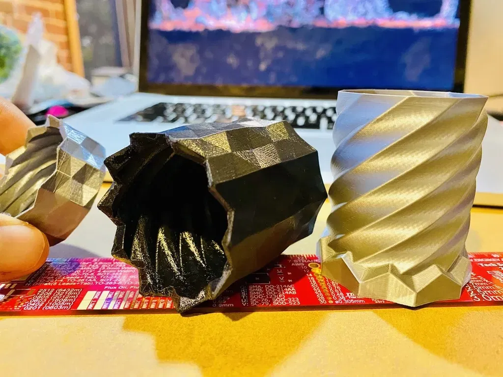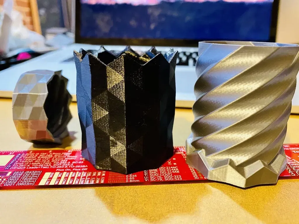 Phần trên được in theo kiểu cổ điển – mất khoảng ~1.5h để in kích thước D40xH50. Tuy nhiên, phần dưới được thiết kế để in ở chế độ bình (eSlicer gọi đây là 'xoắn vòng ngoài' ) và có thể được in trong một nửa thời gian.