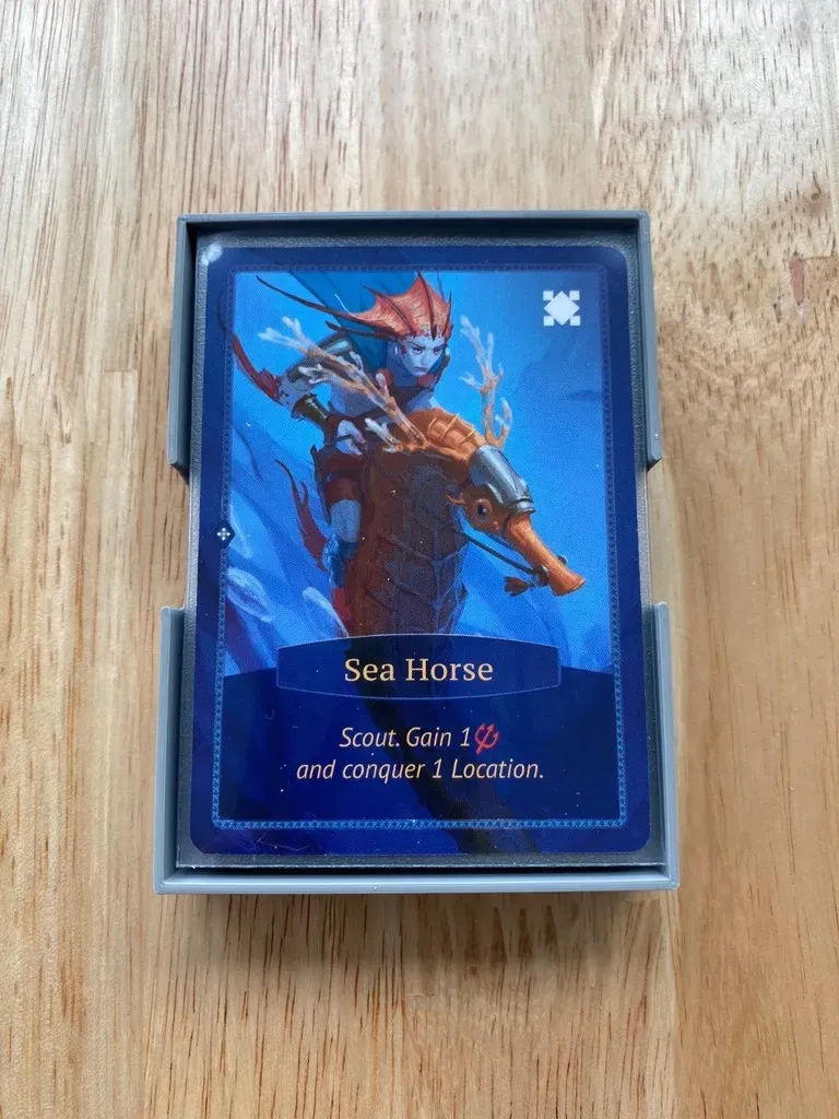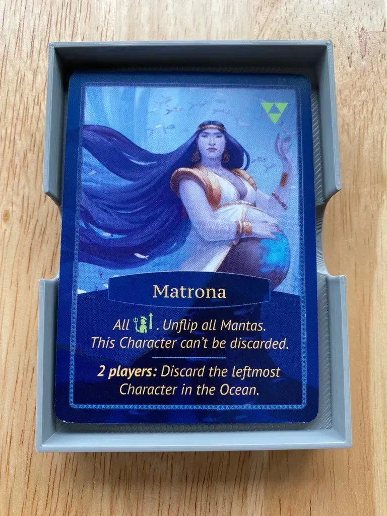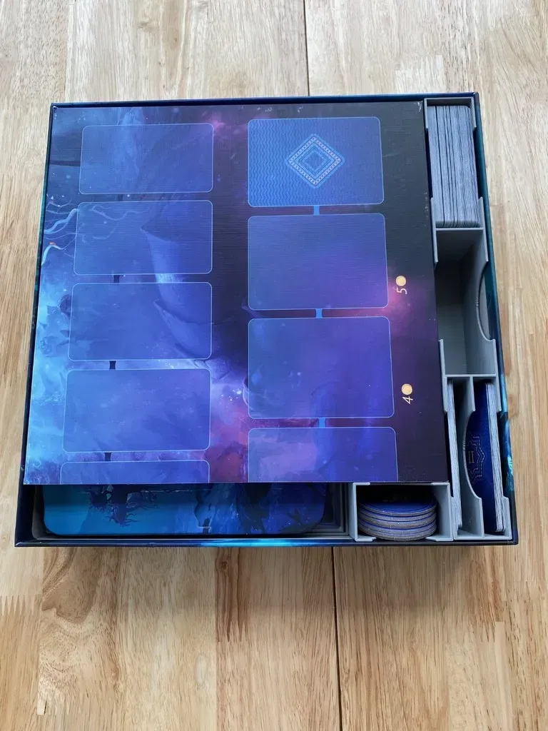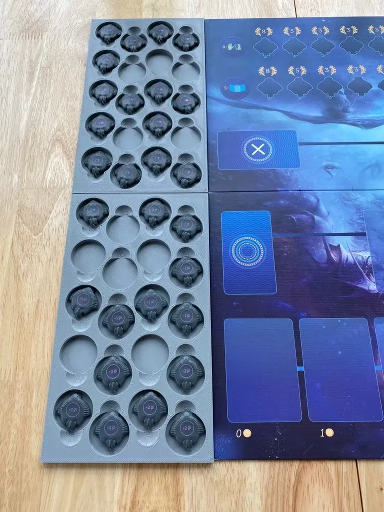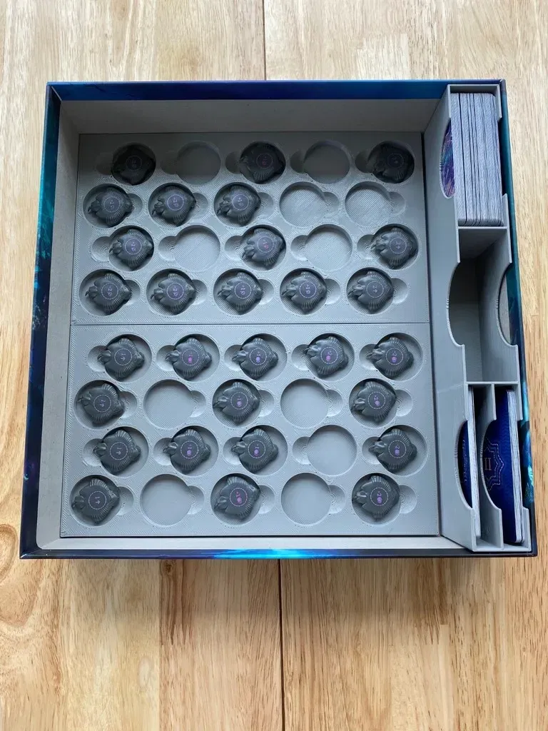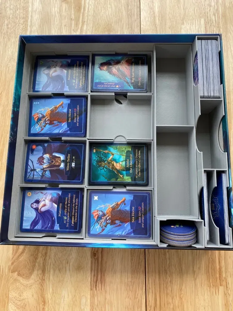 Đây là một insert tôi thiết kế để chứa Aquatica và phần mở rộng Cold Waters của nó trong hộp trò chơi cơ bản. Mỗi người chơi có khay riêng, khay này chứa các thẻ bài khởi đầu của họ trên một cái giếng chứa manta đã được huấn luyện. Đối với các manta hoang dã, bạn có thể phân loại chúng vào hai khay phẳng như trong hình. Điều này giúp giữ cho các manta hoang dã được tổ chức theo loại, và khi đến lúc chơi, bạn chỉ cần đặt các khay bên cạnh bảng. Bộ tổ chức cũng cung cấp các vị trí lưu trữ riêng cho các nhân vật đại dương, các vị vua, các bộ tộc cấp I, các bộ tộc cấp II, các vị trí độ sâu và các ô mục tiêu.