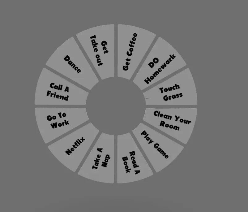 Bánh xe Fortune/lựa chọn này sẽ cho phép bạn ngẫu nhiên tìm ra bước đi tiếp theo khi bạn cảm thấy chán. Có một tấm lót trống đi kèm, vì vậy bạn có thể viết bất kỳ hoạt động nào bạn muốn lên đó. Dù là thể thao, phim ảnh, đi bộ đường dài, dọn dẹp nhà cửa, chỉ cần thêm nó vào bánh xe và quay nó