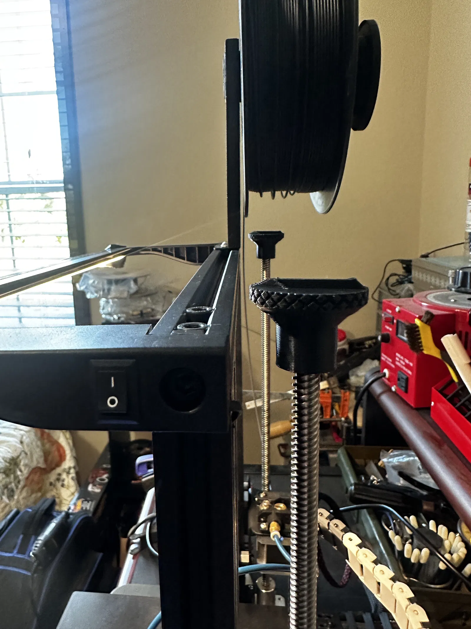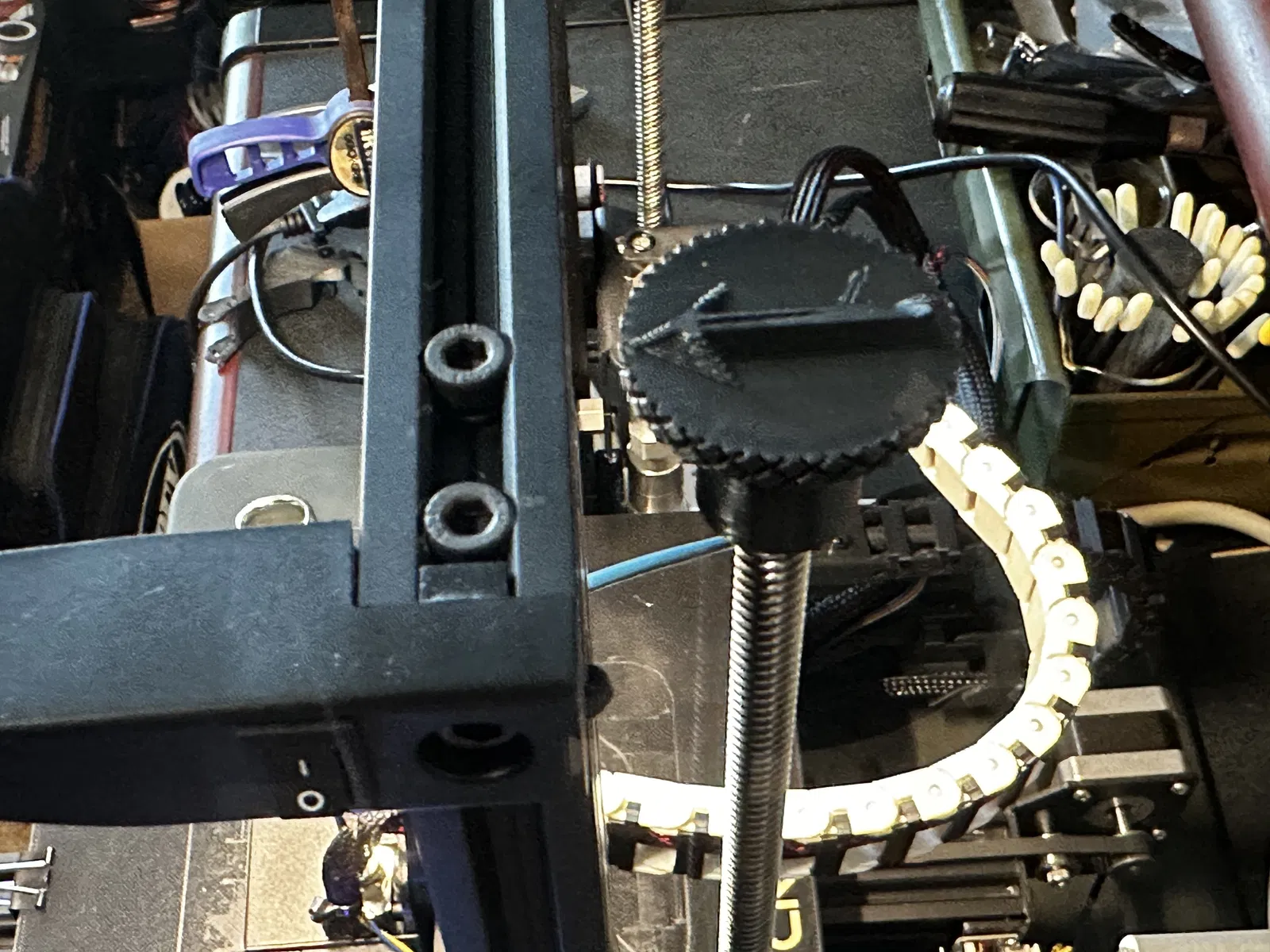 Tùy thuộc vào độ chính xác của máy in, cái núm này có thể bị co lại nhỏ quá. Tôi đã in thử và dùng súng nhiệt để làm mềm vật liệu, sau đó dễ dàng vặn chặt vào đầu trục Z. Nó cung cấp một dấu hiệu trực quan dễ nhìn về vị trí trục Z đang di chuyển. Đây là món đồ cần có cho các máy in dùng trục Z kép (dual z axis) để bạn biết liệu có bị bỏ bước ở một bên hay không.