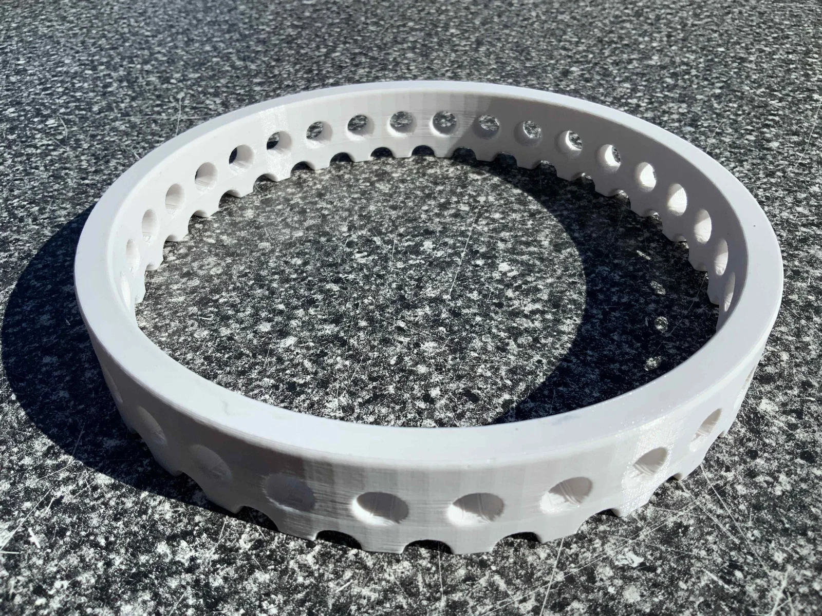 Giới thiệu Tôi sở hữu một gara với mái phẳng. Để bảo vệ mái khỏi ánh sáng UV, đã có đá cuội thô được đặt lên trên. Đá cuội không nên làm tắc cống, vì vậy tôi đã thiết kế một hàng rào nhỏ. Xin vui lòng xem : In ấn Được in bằng PETG với 3 lớp viền. Được in màu trắng vì hàng rào tiếp xúc với nhiệt, đặc biệt là trên mái gara vào mùa hè. OpenSCAD Tệp OpenSCAD đã được cung cấp. Xin lưu ý rằng việc kết xuất mất rất nhiều thời gian. Tôi không đo, nhưng tôi nghĩ ít nhất là 30 phút. Xin cho tôi biết nếu bạn biết cách tốt để làm tròn một ống. Giải pháp của tôi để sử dụng extrude rất tốn thời gian. Tuyên bố từ chối trách nhiệm Xin vui lòng sử dụng theo rủi ro của riêng bạn. Hàng rào vừa mới (tháng 8 năm 2022) được lắp đặt trên mái. Tôi không có kinh nghiệm về việc a) hàng rào có cho phép đủ lượng mưa đi qua các lỗ dưới điều kiện mưa lớn hay không b) hàng rào có đủ mạnh để giữ đá cuội tránh xa cống hay không c) hàng rào có nâng lên sau một số cơn mưa vì nó được in với 20% độ đầy hay không. Điều này có thể dẫn đến việc đá cuội rơi vào cống và làm tắc nghẽn d) PETG có bị chảy trong các tình huống mùa hè rất nóng hay không