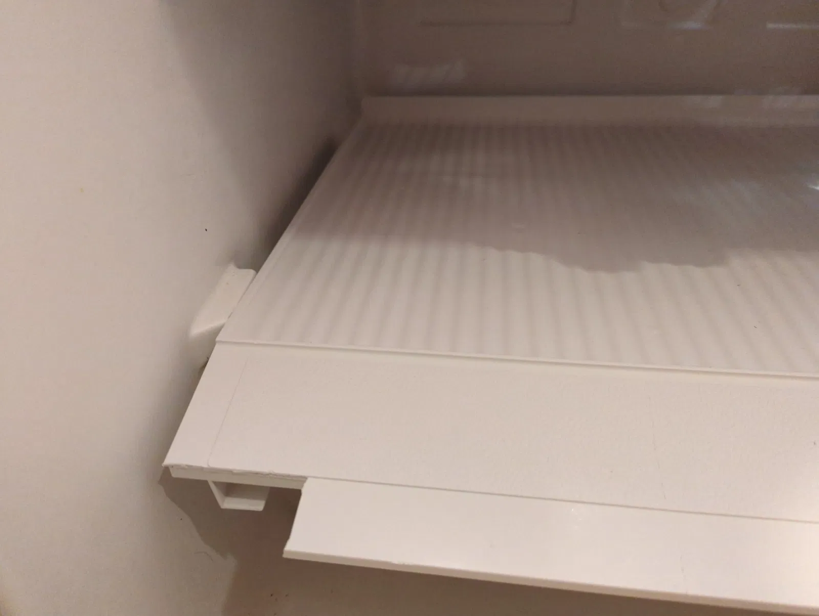 Tủ lạnh G.E Americana cũ của tôi đã gặp vấn đề khi kệ dưới cùng resting trên hai mép nhỏ ở hai bên trước. Nó thường xuyên di chuyển sang một bên và rơi khỏi mép xa, làm đổ tất cả các món đồ. Chúng tôi thường sống với nó nghiêng sang một bên. Không còn nữa. Đây là những miếng đệm tùy chỉnh giữ kệ ở giữa để nó có thể resting như mong muốn trên các mép. Có những cái cụ thể cho bên trái và bên phải. Mỗi cái gắn vào kệ và do độ dốc của kệ, chúng khóa vào vị trí và sẽ không trượt từ trước ra sau.