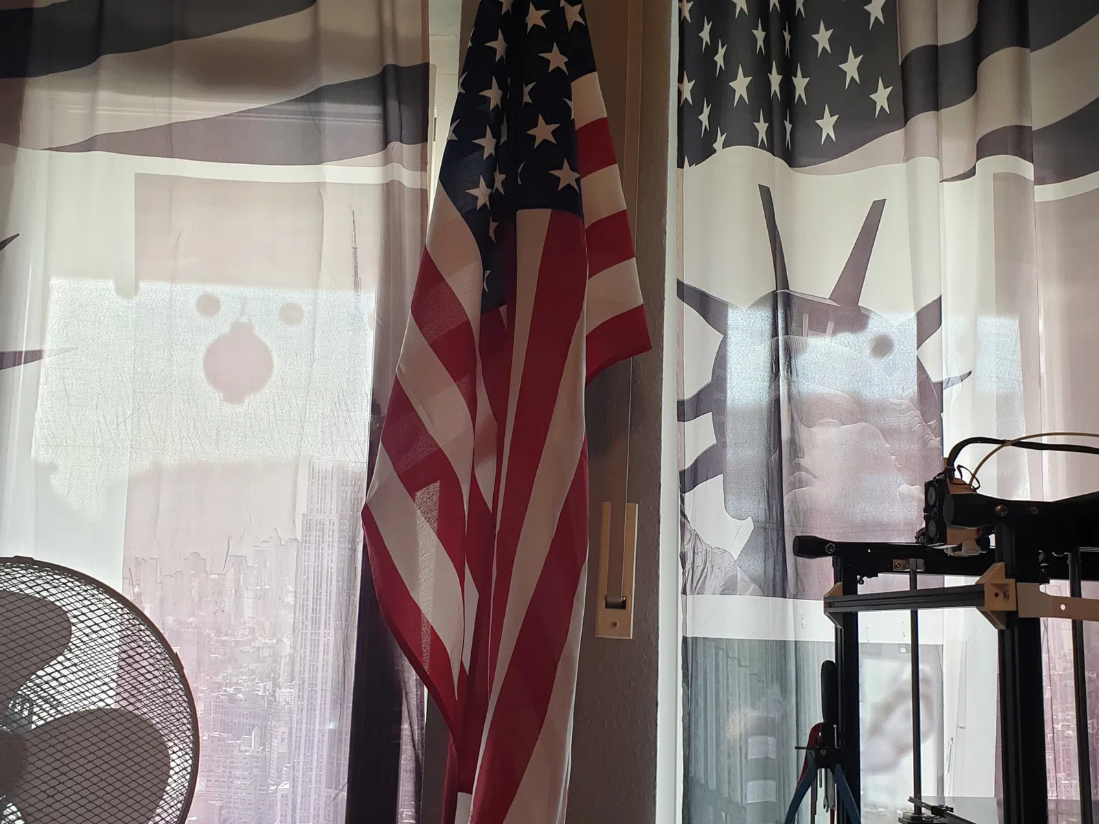 Cờ được mang từ Mỹ về cho tôi. Giá treo tường nguyên bản khiến cờ treo quá thấp trong phòng. Vì vậy, tôi đã thiết kế một cái riêng cho mình.
