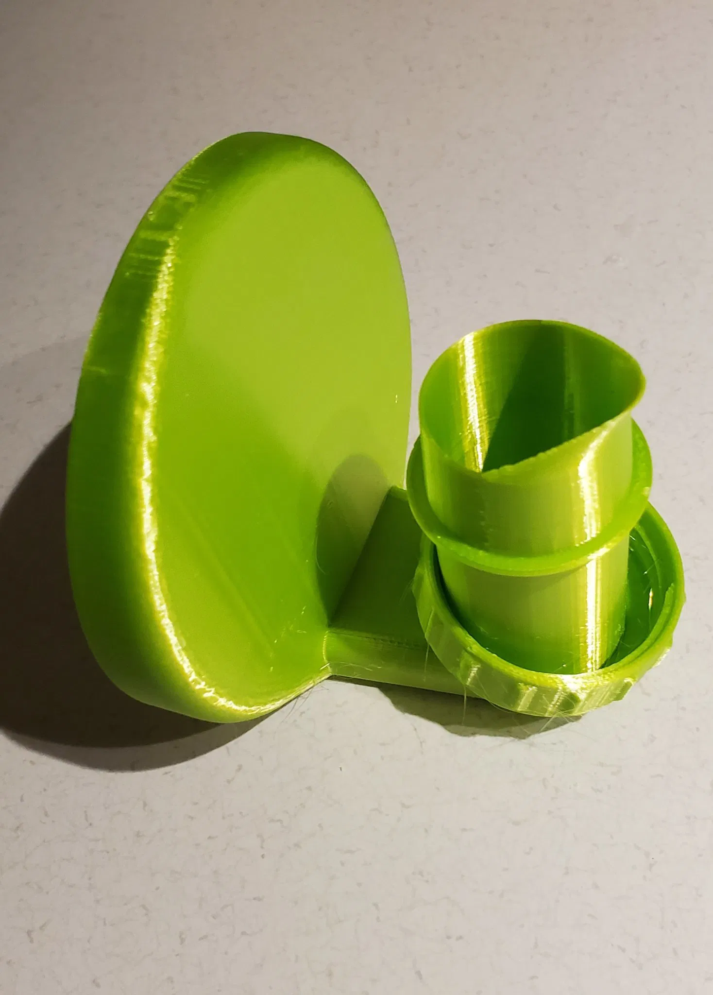 Tôi đã in bằng Overture Silk Neon Green PLA, chiều cao lớp .20, 3 viền và 20% độ đầy gyroid, và đã sơn hỗ trợ cho nắp và mép cốc.