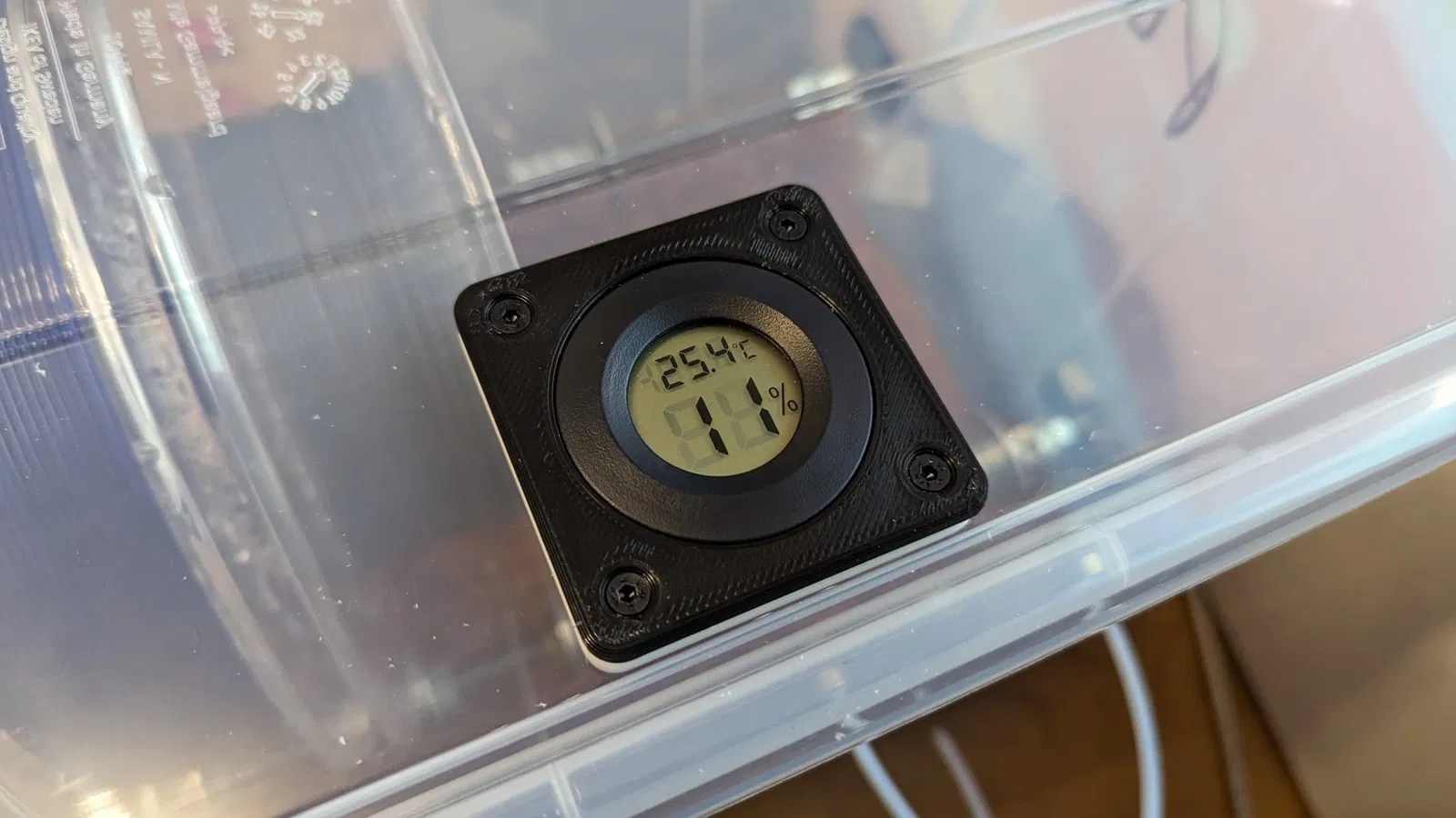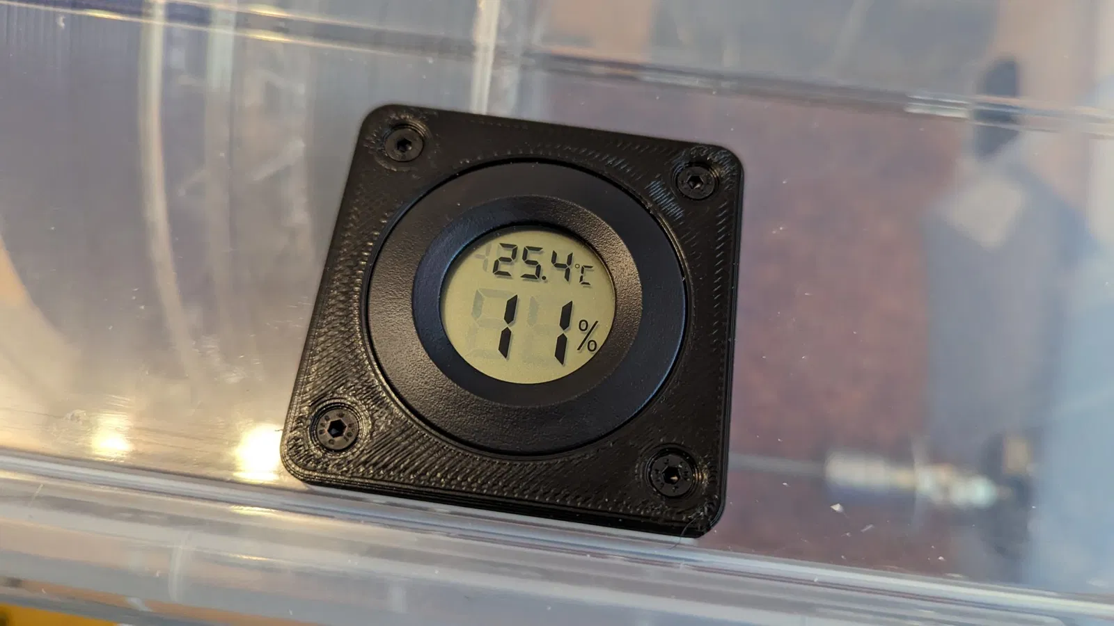 Đây là một giá đỡ nhiệt kế/độ ẩm rất đơn giản. Tôi thiết kế nó cho hộp khô Samla của mình, nhưng nó có thể được sử dụng trên nhiều hộp khô khác có đủ không gian cho nhiệt kế/độ ẩm.