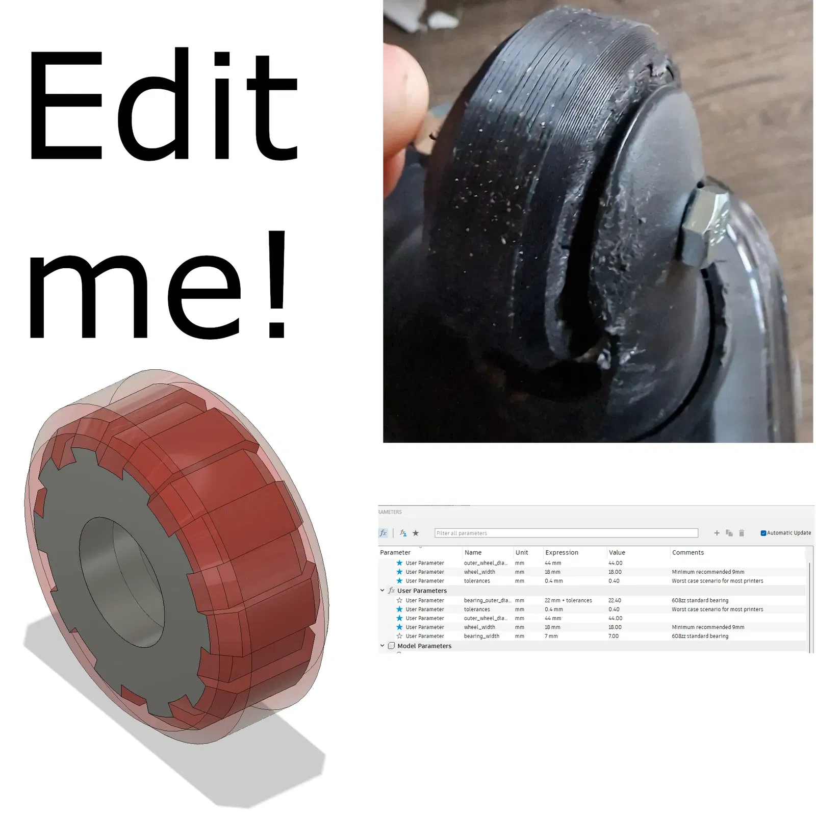 Mặc định, nó có đường kính 48mm và độ dày 18mm. Sử dụng vòng bi 608ZZ được đặt bên trong trong quá trình in (chỉ cần tạm dừng trước khi các lớp được in lên vòng bi!). Đã thử nghiệm với vali của tôi và hoạt động rất tốt, TPE (bạn cũng có thể sử dụng TPU!) đã hoạt động tuyệt vời và thậm chí còn tăng độ bám cho bánh xe.