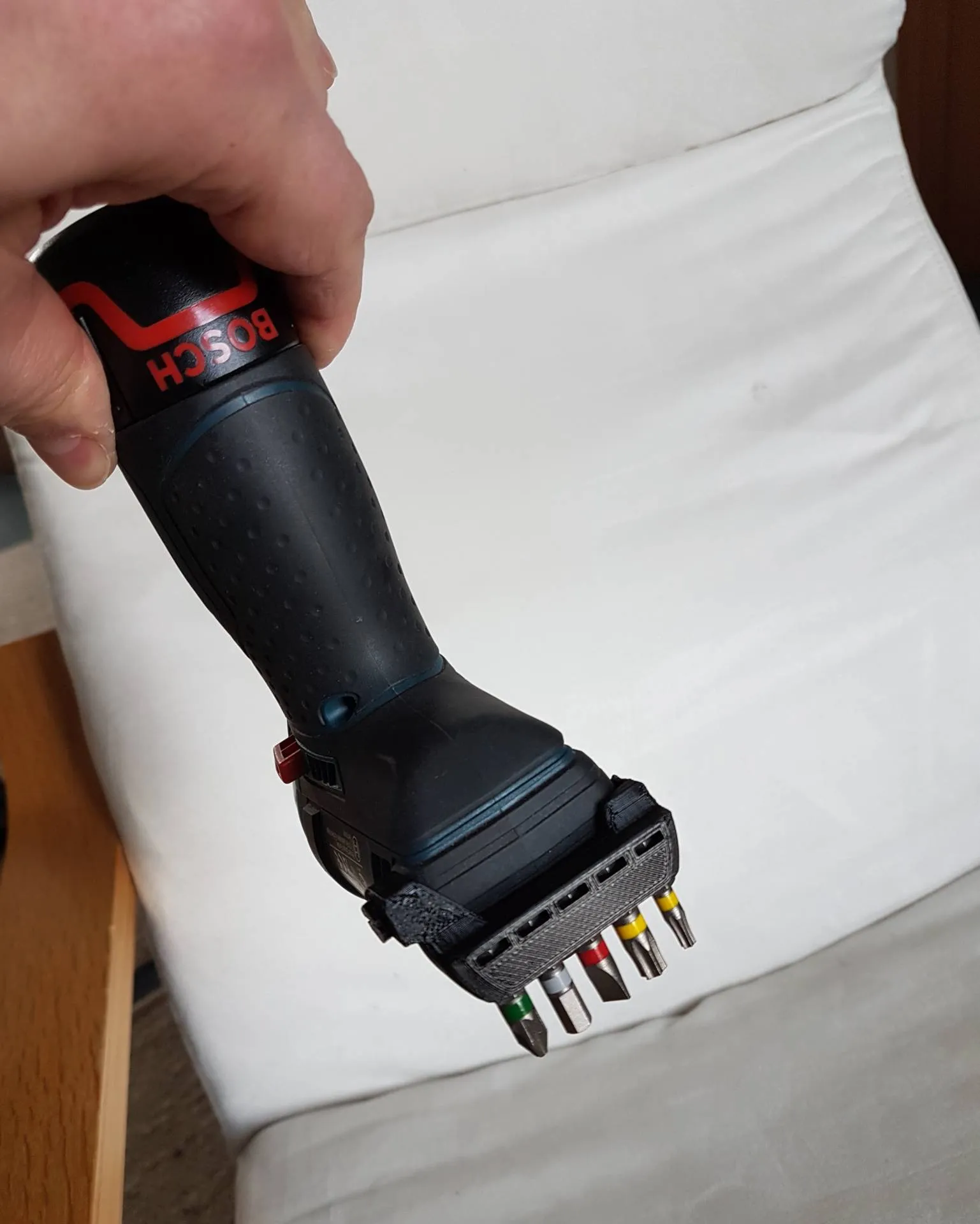 Tôi thích Bit-Holder cho máy vặn vít không dây (Bosch) và đã sử dụng nó trong vài tháng, cho đến khi cuối cùng nó bị hỏng gần đây do có một điểm yếu ở cánh tay bên phải. Dù sao thì phiên bản gốc quá chặt (phải phóng to và mở rộng các lỗ hex để có thể đẩy các bit vào, xem make), tôi đã quyết định tạo ra phiên bản remix của riêng mình với sự vừa vặn tốt hơn, các cạnh mượt mà hơn và thiết kế đối xứng hơn. Nhưng tôi đã giữ lại ý tưởng hay của việc gắn nó vào các khe nhỏ bên trái và lỗ vít ở bên phải. Sau các bản in thử nghiệm đầu tiên, tôi nhận ra rằng nam châm không thực sự cần thiết nếu các lỗ bit được phóng to đúng cách và hơi thuôn (chỉ 0.5°), tức là hẹp ở đáy hơn ở đỉnh. Các bit không rơi ra ngay cả khi lật ngược (xem ảnh) và vẫn có thể được kéo ra bằng hai ngón tay. Và tôi cũng đã thay đổi thiết kế để đai ốc M5 có thể được chèn vào sau khi in, vì vậy không còn cần phải dừng in giữa chừng và mô hình có thể được xoay để sử dụng ít hỗ trợ hơn. (Tôi đã nghĩ đến việc thiết kế nó mà không cần hỗ trợ, nhưng điều đó thực sự không giảm bớt lượng filament cần thiết thêm nữa. Mô hình hiện tại có thể được in với chưa đến 6g hoặc 2m filament (xem tính toán của eSlicer) Đối với những người thích phiên bản có nam châm (6x3mm), tôi đã thêm một phiên bản với các hình lục giác không thuôn nơi nam châm có thể (phải) được chèn vào trong quá trình in (hướng in thẳng đứng yêu cầu nhiều hỗ trợ hơn). Trong trường hợp này chỉ vui lòng dừng in sau 17mm (tầng 85 với các tầng 0.2mm). Phiên bản không từ tính có thể được in ở bất kỳ hướng nào mà không cần dừng lại. So với thiết kế gốc, tôi đã giảm số tầng ở trên các nam châm. Không có lý do gì để che chắn chúng nhiều hơn mức cần thiết. Đối với những ai không có vít và đai ốc M5 sẵn có, tôi cũng đã thêm một vít M5x15 với đầu phẳng và một đai ốc M5. Tôi không nhúng đai ốc trực tiếp vào thiết kế, vì các ren nên luôn được in theo chiều thẳng đứng để có độ chính xác tốt hơn của bản in (độ phân giải tốt hơn nhiều theo hướng z). Vì vậy, hãy sử dụng các lớp thích ứng hoặc chiều cao lớp nhỏ khi in vít và đai ốc để có ren hoàn hảo. (Và đối với vít, tôi khuyên bạn nên in với 100% độ đặc). Vít có đầu lục giác 8mm - và tôi đã thêm một khe để bạn có thể vặn nó bằng móng tay của mình :-) (Nhân tiện: mặc dù một bức ảnh cho thấy một đai ốc kim loại M5 bình thường, tôi đã gắn giá đỡ vào khoan bằng đai ốc in (vì vậy thực sự hoạt động), nhưng điều đó sẽ khá vô hình trong bức ảnh) Tôi sử dụng giá đỡ mũi khoan với phiên bản 10.8V cũ của máy khoan/vít không dây Bosch GSR và theo những bức ảnh tôi tìm thấy, nó cũng nên phù hợp với phiên bản GSR-12V-15 mới hơn. Thật không may, nó KHÔNG phù hợp với phiên bản máy khoan búa GSB-120-LI (mà tôi cũng sở hữu), vì Bosch đã sửa đổi thiết kế một chút. (Tôi có thể sẽ tải lên một phiên bản khác sau) Cập nhật (2023-07-30): Theo yêu cầu của @AiRLAC_2011, tôi đã tải lên một phiên bản sửa đổi nhẹ với cánh tay vít mạnh hơn. (Tôi phải thừa nhận, các bức tường khá mỏng, nhưng tôi chưa bao giờ gặp vấn đề với nó). Khung xung quanh lỗ vít giờ đây rộng hơn +1.2mm và bức tường dưới vít dày hơn +0.6mm…. và sau đó vài giờ sau, tôi đã thêm một phiên bản “cực kỳ chắc chắn” nữa theo yêu cầu, trong đó bên kia cũng đã được làm dày thêm 0.8mm (chưa bao giờ gặp vấn đề với nó cho đến giờ - nhưng nếu bạn thực sự cố gắng phá hủy điều gì đó bằng cách áp dụng lực, bạn có thể thành công với thiết kế gốc. Tôi hy vọng bản cập nhật này sẽ bền lâu hơn) Cập nhật (2023-10-03): Đã tải lên tệp STEP của phiên bản chắc chắn theo yêu cầu của @MBart_304769 Cài đặt in được khuyến nghị: Phiên bản không có nam châm thì tốt nhất nên in ở mặt sau, điều này giảm thiểu sự hỗ trợ cần thiết. Sự hỗ trợ không cần thiết cũng có thể tránh được bằng cách đặt Support X/Y Distance là 2.5mm và Support Overhang Angle là ≥ 70. Với những thiết lập này, tôi thậm chí không cần đến các bộ chặn hỗ trợ cho các lỗ. Đối với phiên bản có nam châm thì khác, vì nó phải được in thẳng đứng và quá trình in phải dừng lại sau 17mm/layer 85 để chèn các nam châm. Chiều cao lớp 0.2mm và 20% độ đặc là ổn (trừ cho vít nơi tôi khuyên nên sử dụng 100% độ đặc). Bản in với thậm chí ít hơn 6g cũng sử dụng chiều cao lớp thích ứng/biến đổi để có bề mặt cong mượt mà.