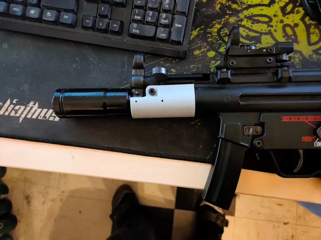 Một bộ giảm thanh đơn giản để che một phần mở rộng nòng lên đến 210mm chiều dài tổng thể. Nòng 90mm nguyên bản của tokyo marui mp5k không đáp ứng được nhu cầu chính xác của tôi. Bạn sẽ muốn in khá chậm, để có thể in thành công ren M14x1mm.