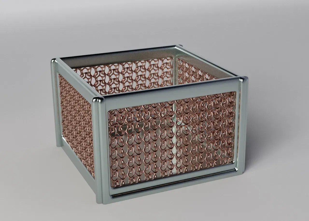 Một chiếc hộp dệt nghệ thuật. Nó có thể hoạt động như một tác phẩm điêu khắc trên kệ, giá đỡ hoặc chứa đựng.