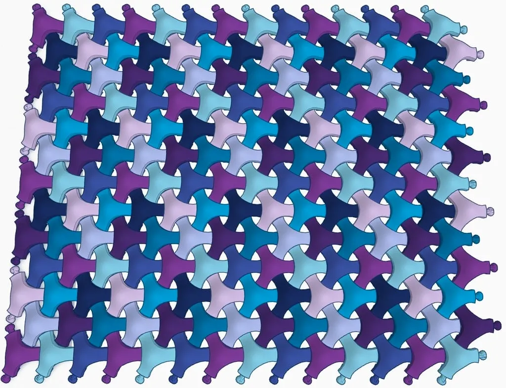 Để rõ ràng hơn, các màu tôi đã chọn cho Mains của mỗi tấm trong thiết kế được hiển thị ở đây đều cùng một màu. Vì vậy, tất cả các mảnh màu vàng bạn thấy đều được kết nối với nhau qua Subs, cũng như tất cả các mảnh màu trắng và cam. Nhưng không có sự kết nối rõ ràng nào trong vải thu được giữa các tấm màu trắng, vàng hoặc cam. Giống như một loại vải truyền thống dựa trên sợi, mỗi tấm được giữ chặt bởi sự đan xen kết hợp của các mảnh cấu thành của cả ba tấm.